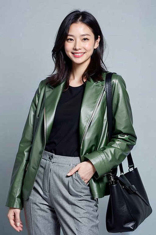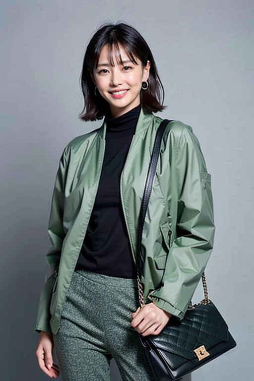 | 緑のジャケットとグレーのパンツを着た女性が、黒いバッグと黒い財布を手に持ち微笑んでいる。吉田千鶴子、ニュートラルカラー、ストック写真、プライベートプレス | ||