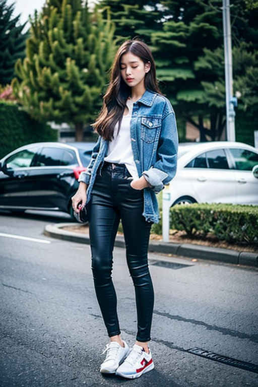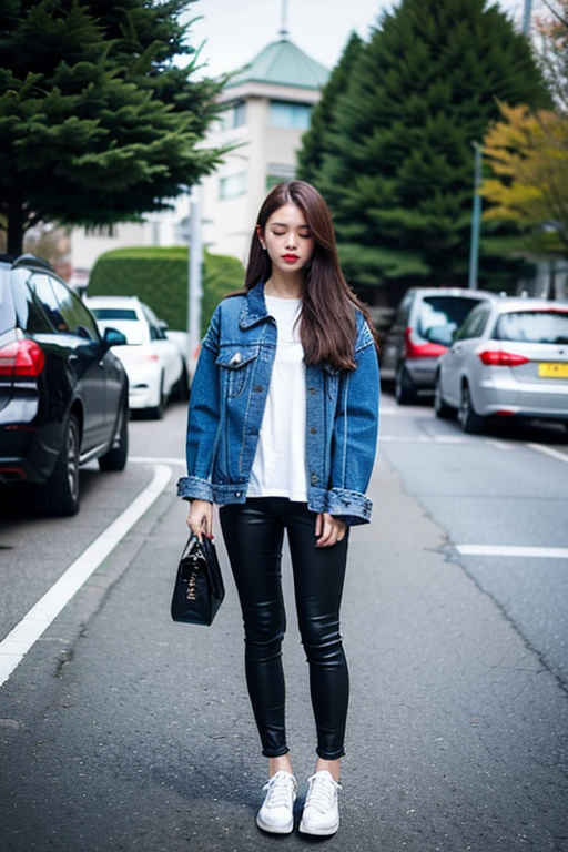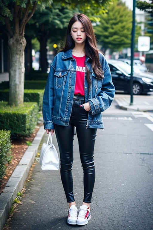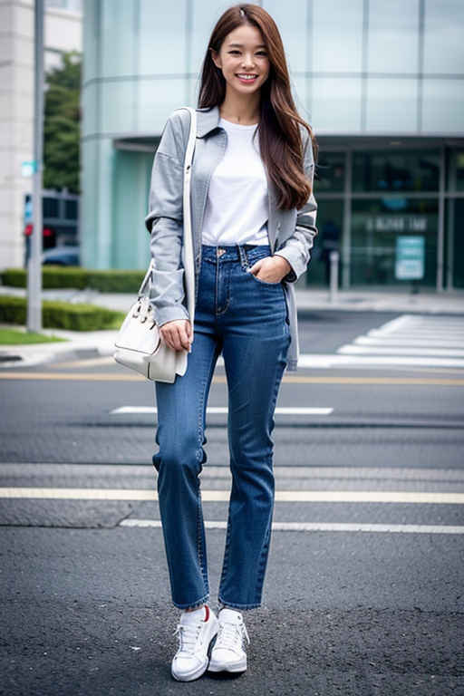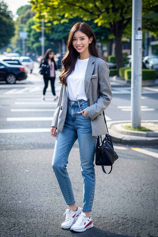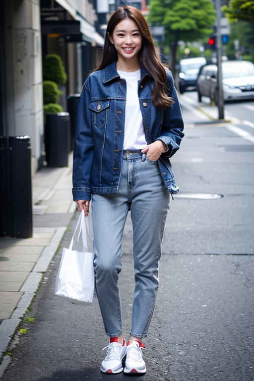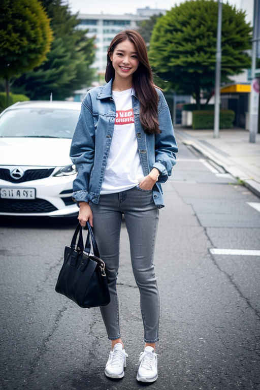 | ③ Tagger | 1girl, solo, bag, pants, brown hair, shoes, blurry, smile, blurry background, jacket, sneakers, full body, outdoors, shirt, grey pants, standing, realistic, denim, handbag, looking at viewer, white shirt, long hair, jeans, teeth, holding, long sleeves, holding bag | |