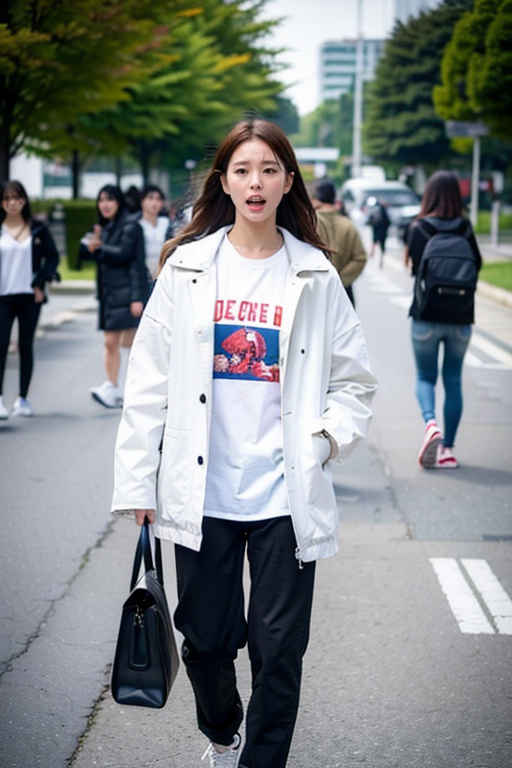 | ソロ、パンツ、靴、バッグ、白いパンツ、シャツ、ジャケット、白いシャツ、リアル、ポケットに手、スニーカー、茶髪、白い履物、女の子 1 人、屋外、見る人を見る、全身、長い髪、口を開けている、ぼやけている、写真の背景、立っている、ハンドバッグ、歩いている、はだけた服、黒いジャケット | |