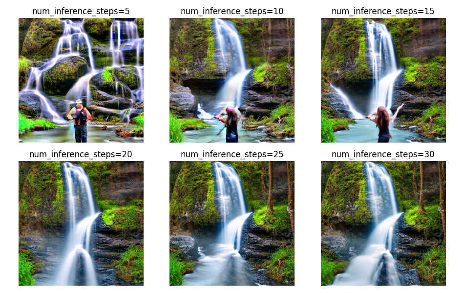 ## sd_008.py「自然と滝の写真」ステップ数(num_inference_steps)の変化