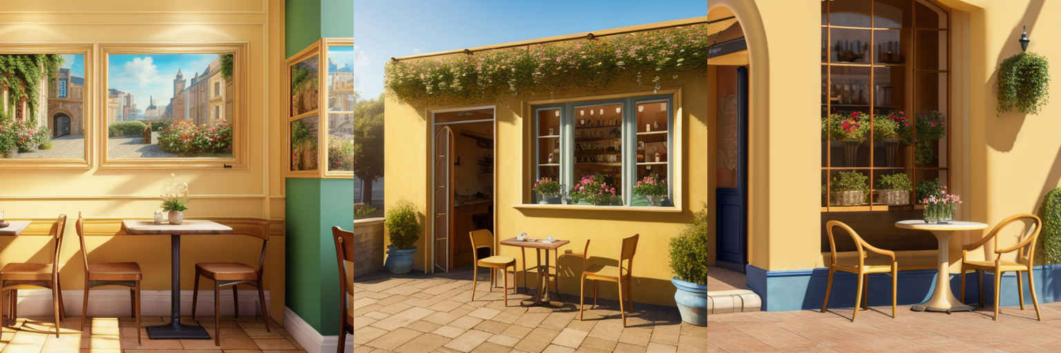 | P4 | (masterpiece, best quality, highres:1.2), (photorealistic:1.37), a highly realistic photograph of a charming cafe, with tables and chairs, with ivy climbing up the walls, and soft golden sunlight illuminates the scene, capturing a peaceful urban moment |