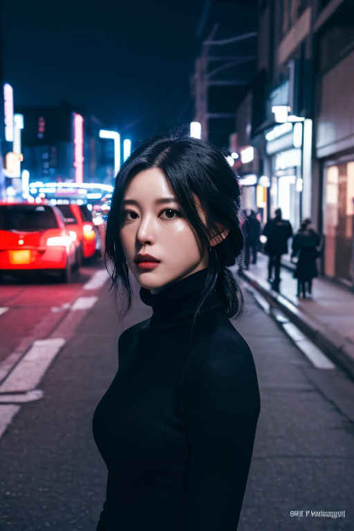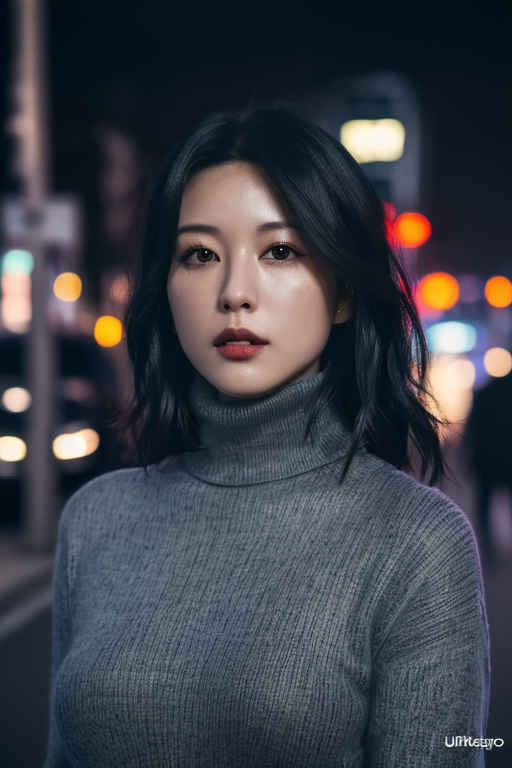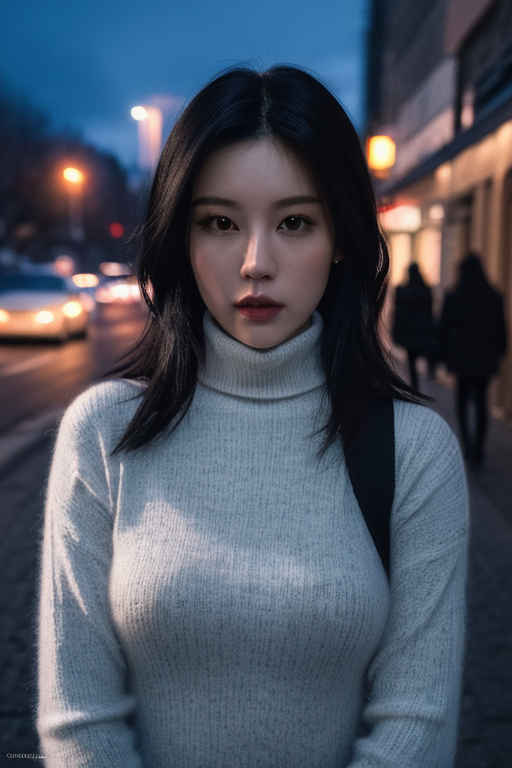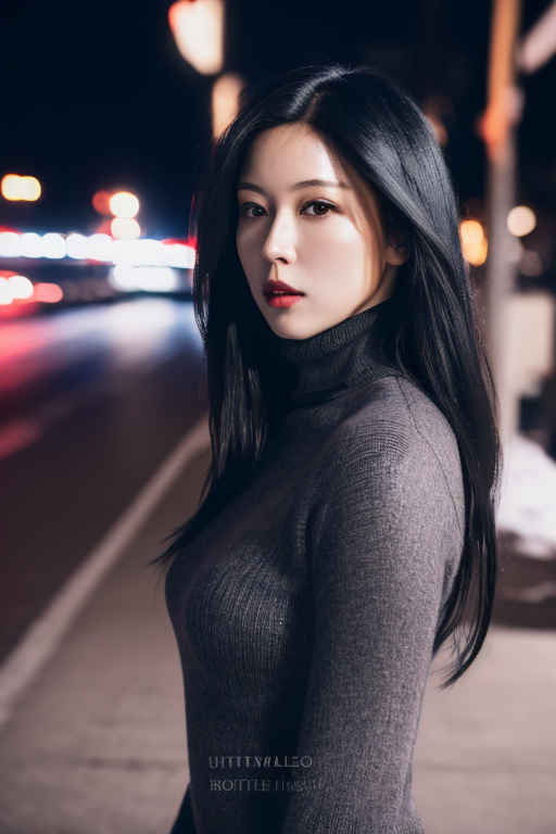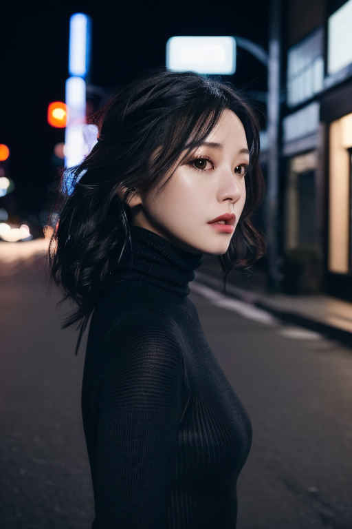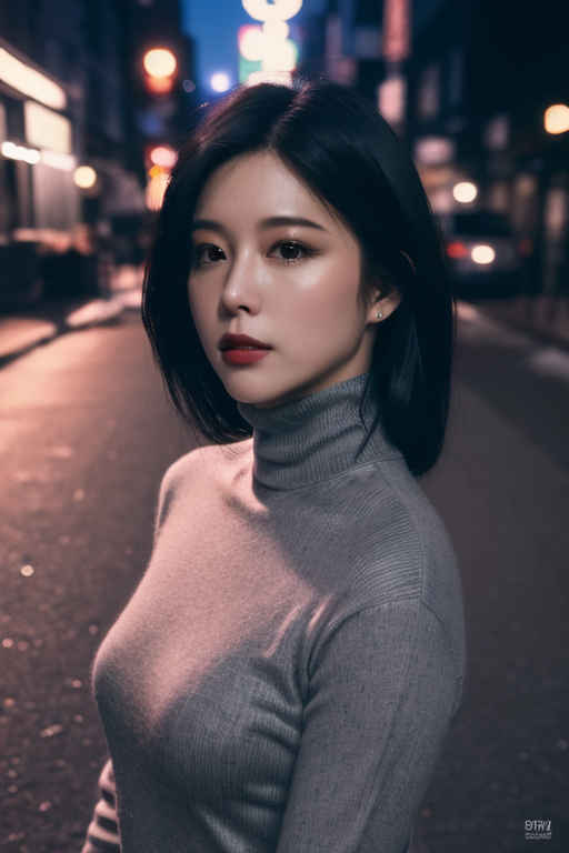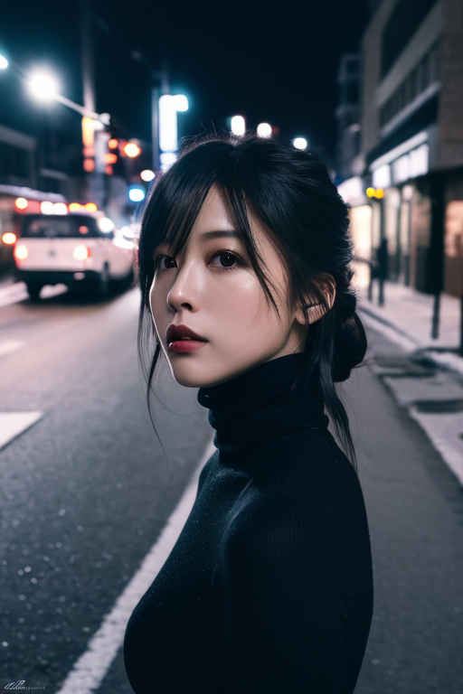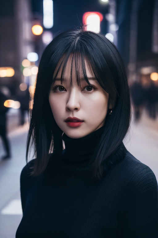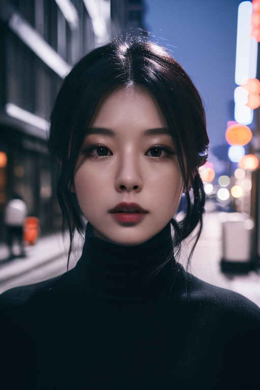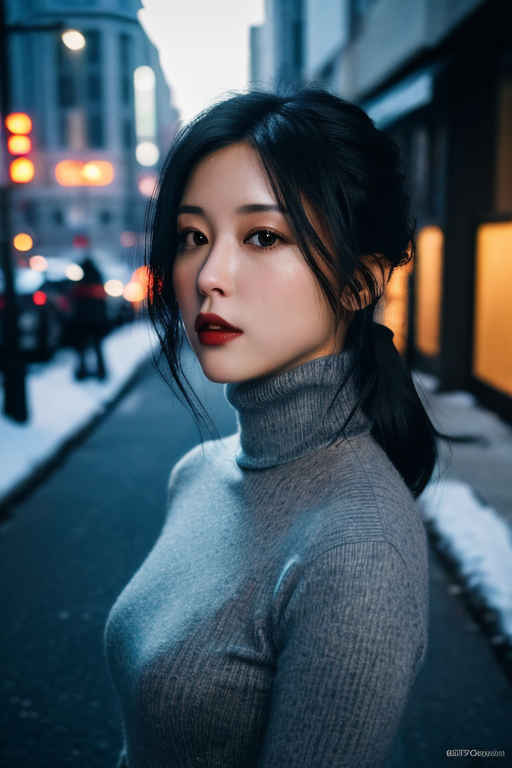 | (8k、最高品質、傑作、超高解像度:1.2)、日本の女の子 1 人、写真、リアル、黒髪、タートルネック、冬、ストリート、映画のような照明。 |