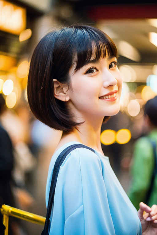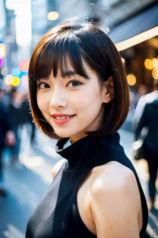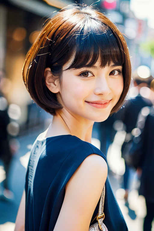| ミディアム(肩から1.2)の刈り上げヘア、傑作、最高品質、ハイレゾ、女性1人、日本人、カメラ目線、(笑顔:0.6)、都会の混雑風景、風、チルトスカート | |