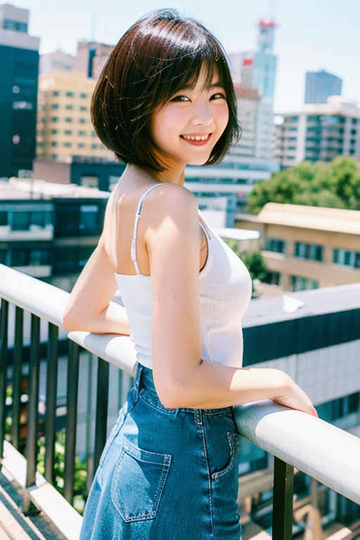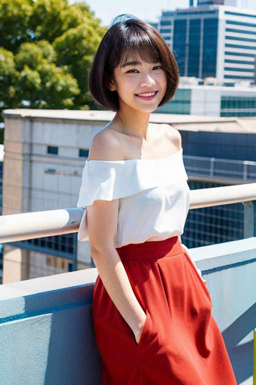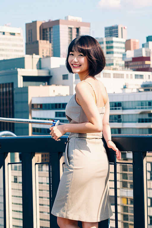 | ミディアム(肩から1.2)の刈り上げヘア、傑作、最高品質、ハイレゾ、1人娘、日本人、カメラ目線、(笑顔:0.6)、フェンスのあるビルの屋上、風、チルトスカート | |