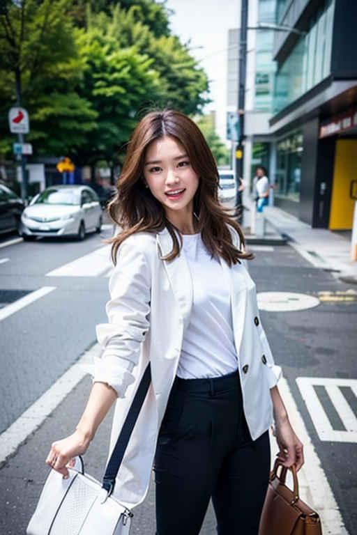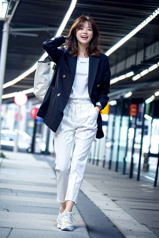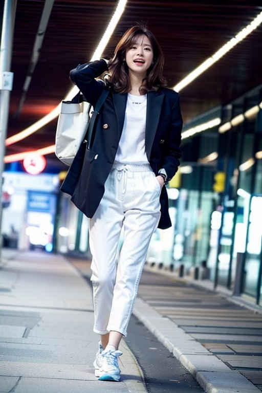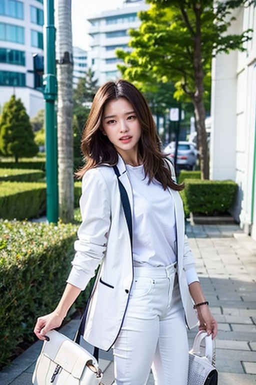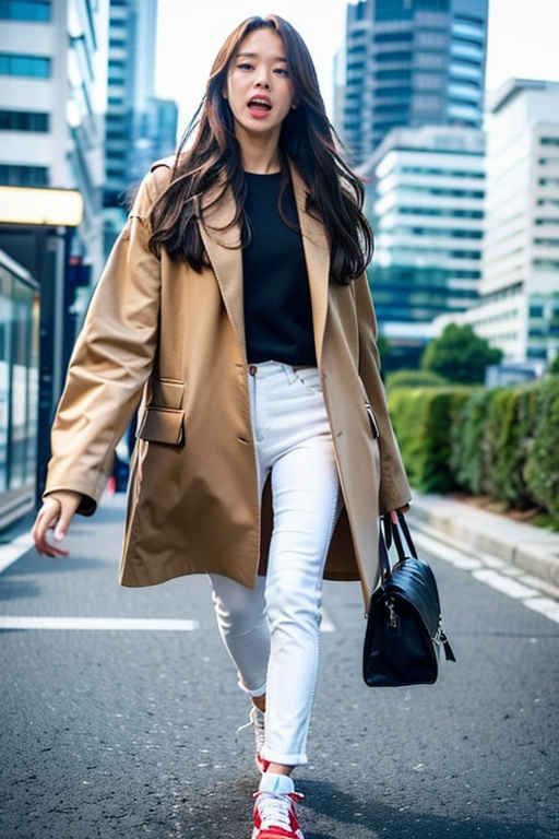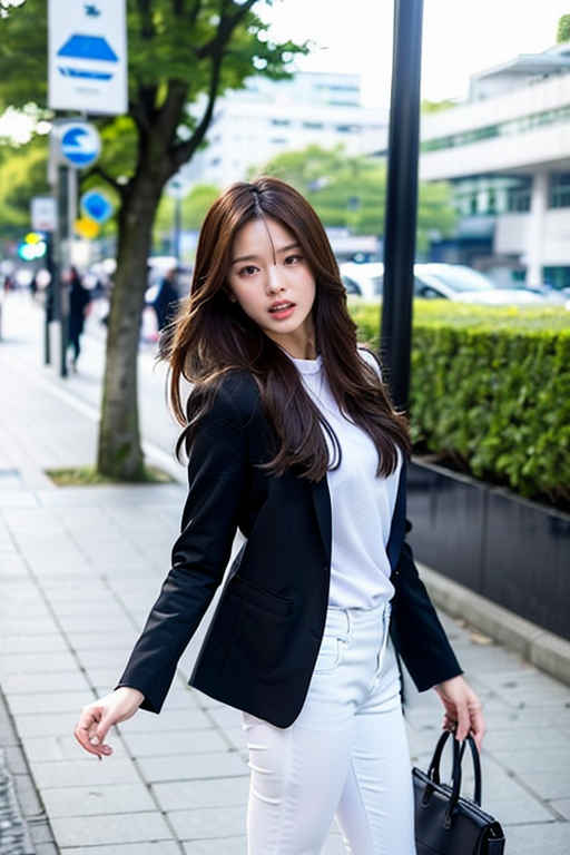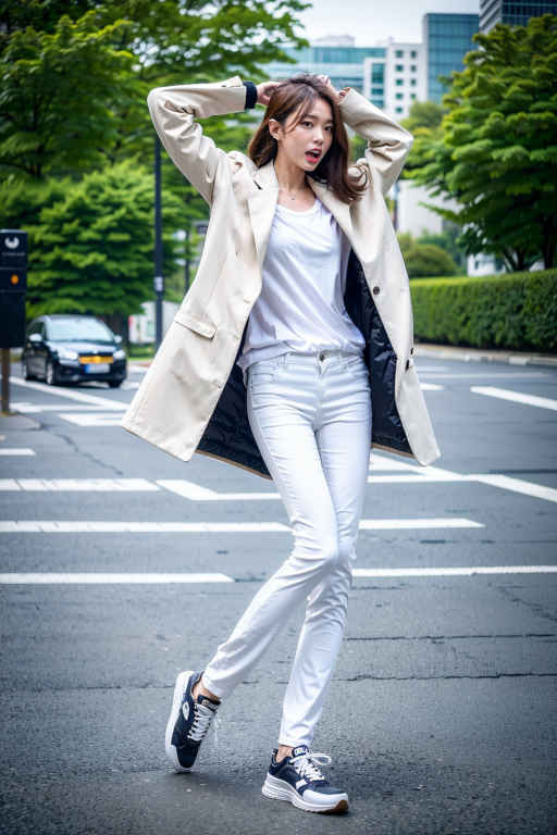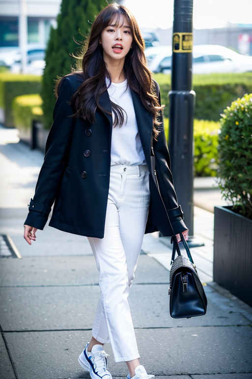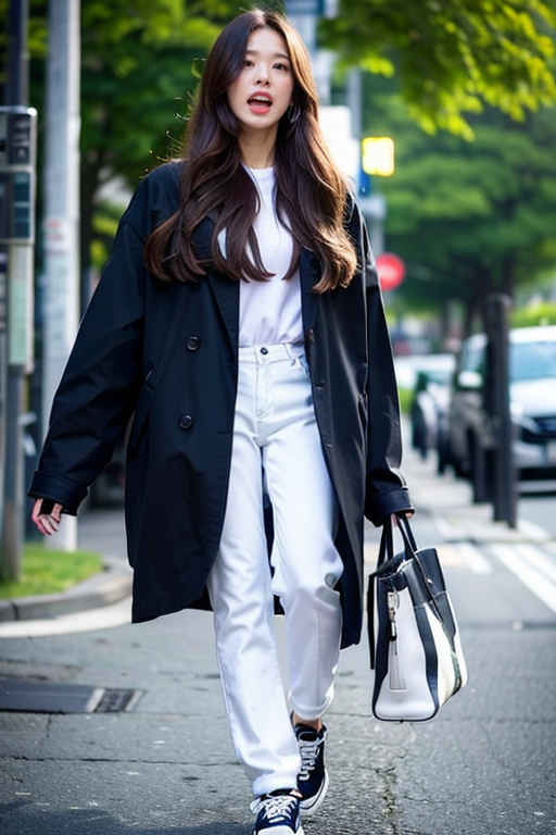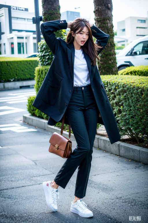 | Prompt | solo, pants, shoes, bag, white pants, shirt, jacket, white shirt, realistic, hand in pocket, sneakers, brown hair, white footwear, 1girl, outdoors, looking at viewer, full body, long hair, open mouth, blurry, photo background, standing, handbag, walking, open clothes, black jacket |