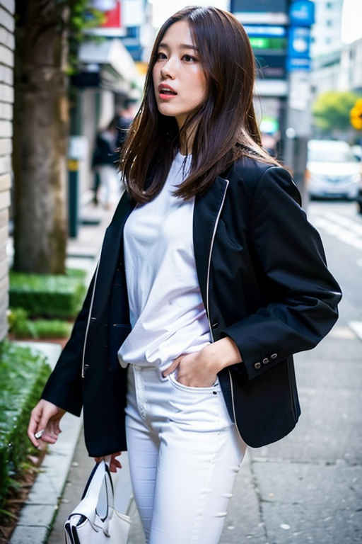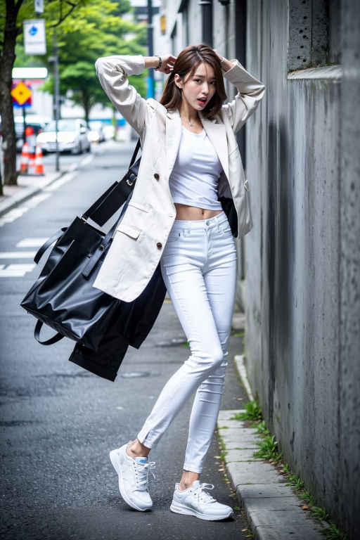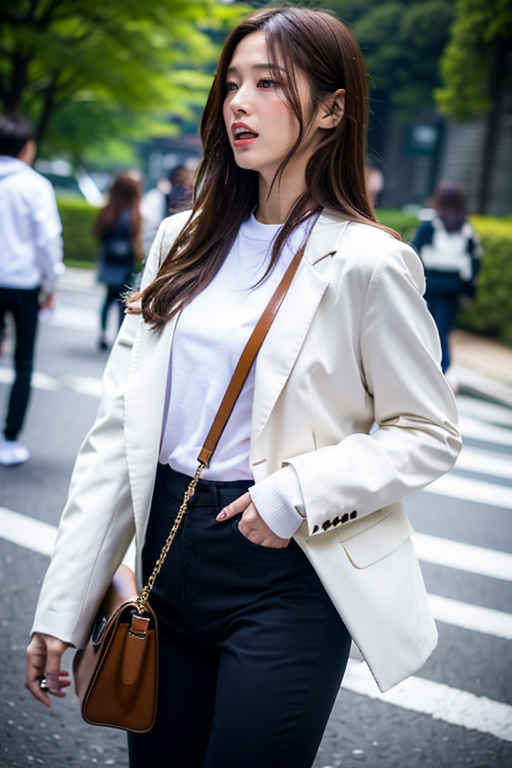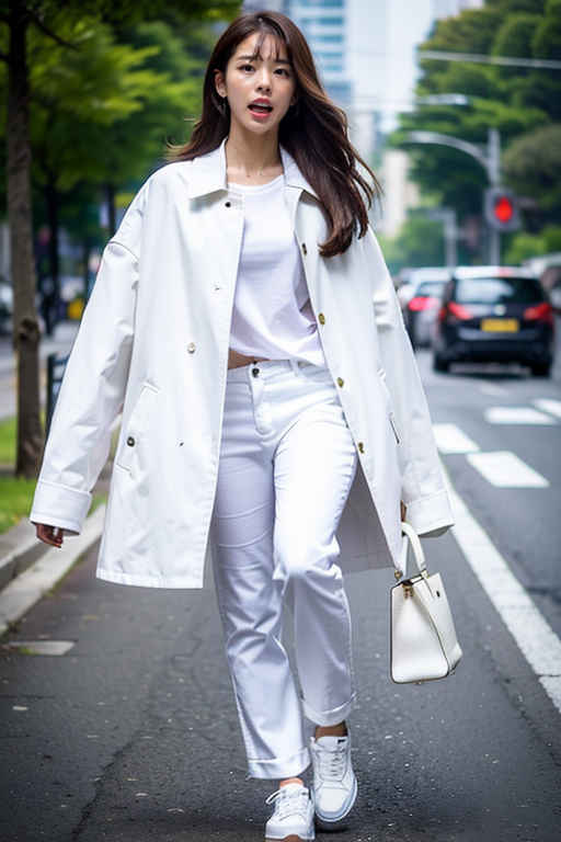 | ソロ、パンツ、靴、バッグ、白いパンツ、シャツ、ジャケット、白いシャツ、リアル、ポケットに手、スニーカー、茶髪、白い履物、女の子 1 人、屋外、見る人を見る、全身、長い髪、口を開けている、ぼやけている、写真の背景、立っている、ハンドバッグ、歩いている、はだけた服、黒いジャケット | |