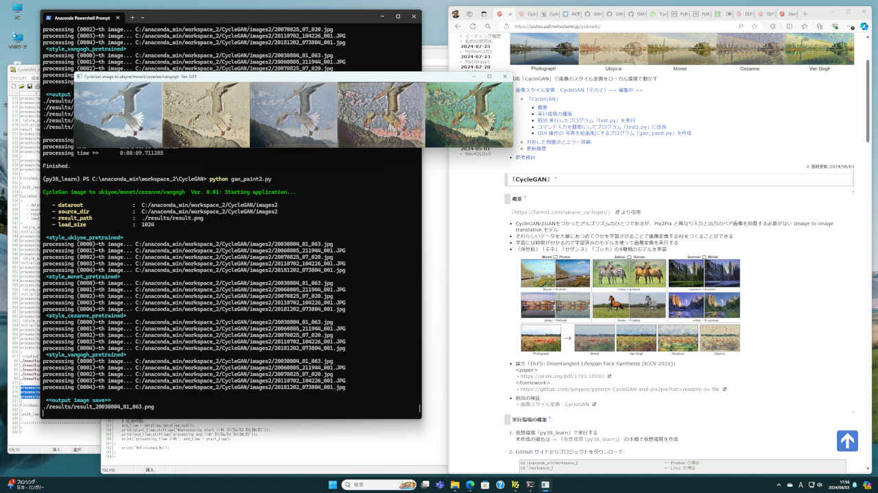 (py38_learn) python gan_paint.py CycleGan image to ukiyoe/monet/cezanne/vangogh Ver. 0.01: Starting application... - dataroot : C:/anaconda_win/workspace_2/CycleGAN/images2 - source_dir : C:/anaconda_win/workspace_2/CycleGAN/images2 - result_path : ./results/result.png - load_size : 1024 <style_ukiyoe_pretrained> processing (0000)-th image... C:/anaconda_win/workspace_2/CycleGAN/images2/20030804_01_063.jpg processing (0001)-th image... C:/anaconda_win/workspace_2/CycleGAN/images2/20060805_211944_001.JPG processing (0002)-th image... C:/anaconda_win/workspace_2/CycleGAN/images2/20070825_07_020.jpg processing (0003)-th image... C:/anaconda_win/workspace_2/CycleGAN/images2/20110702_104226_001.JPG processing (0004)-th image... C:/anaconda_win/workspace_2/CycleGAN/images2/20181202_073804_001.jpg <style_monet_pretrained> processing (0000)-th image... C:/anaconda_win/workspace_2/CycleGAN/images2/20030804_01_063.jpg processing (0001)-th image... C:/anaconda_win/workspace_2/CycleGAN/images2/20060805_211944_001.JPG processing (0002)-th image... C:/anaconda_win/workspace_2/CycleGAN/images2/20070825_07_020.jpg processing (0003)-th image... C:/anaconda_win/workspace_2/CycleGAN/images2/20110702_104226_001.JPG processing (0004)-th image... C:/anaconda_win/workspace_2/CycleGAN/images2/20181202_073804_001.jpg <style_cezanne_pretrained> processing (0000)-th image... C:/anaconda_win/workspace_2/CycleGAN/images2/20030804_01_063.jpg processing (0001)-th image... C:/anaconda_win/workspace_2/CycleGAN/images2/20060805_211944_001.JPG processing (0002)-th image... C:/anaconda_win/workspace_2/CycleGAN/images2/20070825_07_020.jpg processing (0003)-th image... C:/anaconda_win/workspace_2/CycleGAN/images2/20110702_104226_001.JPG processing (0004)-th image... C:/anaconda_win/workspace_2/CycleGAN/images2/20181202_073804_001.jpg <style_vangogh_pretrained> processing (0000)-th image... C:/anaconda_win/workspace_2/CycleGAN/images2/20030804_01_063.jpg processing (0001)-th image... C:/anaconda_win/workspace_2/CycleGAN/images2/20060805_211944_001.JPG processing (0002)-th image... C:/anaconda_win/workspace_2/CycleGAN/images2/20070825_07_020.jpg processing (0003)-th image... C:/anaconda_win/workspace_2/CycleGAN/images2/20110702_104226_001.JPG processing (0004)-th image... C:/anaconda_win/workspace_2/CycleGAN/images2/20181202_073804_001.jpg <<output image save>> ./results/result_20030804_01_063.png ./results/result_20060805_211944_001.png ./results/result_20070825_07_020.png ./results/result_20110702_104226_001.png ./results/result_20181202_073804_001.png processing start >> 2024/08/03 16:11:00 processing end >> 2024/08/03 16:11:10 processing time >> 0:00:09.910690 Finished.・CPU 動作の場合の処理時間