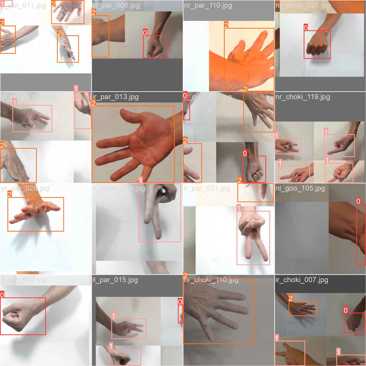 (py_learn) python train.py --epochs 100 --data data/janken4_dataset/janken4_dataset.yaml --weights yolov5s.pt --name janken4_yolov5s・GPU を使用しない場合は以下のコマンドを実行する