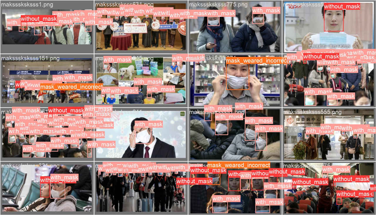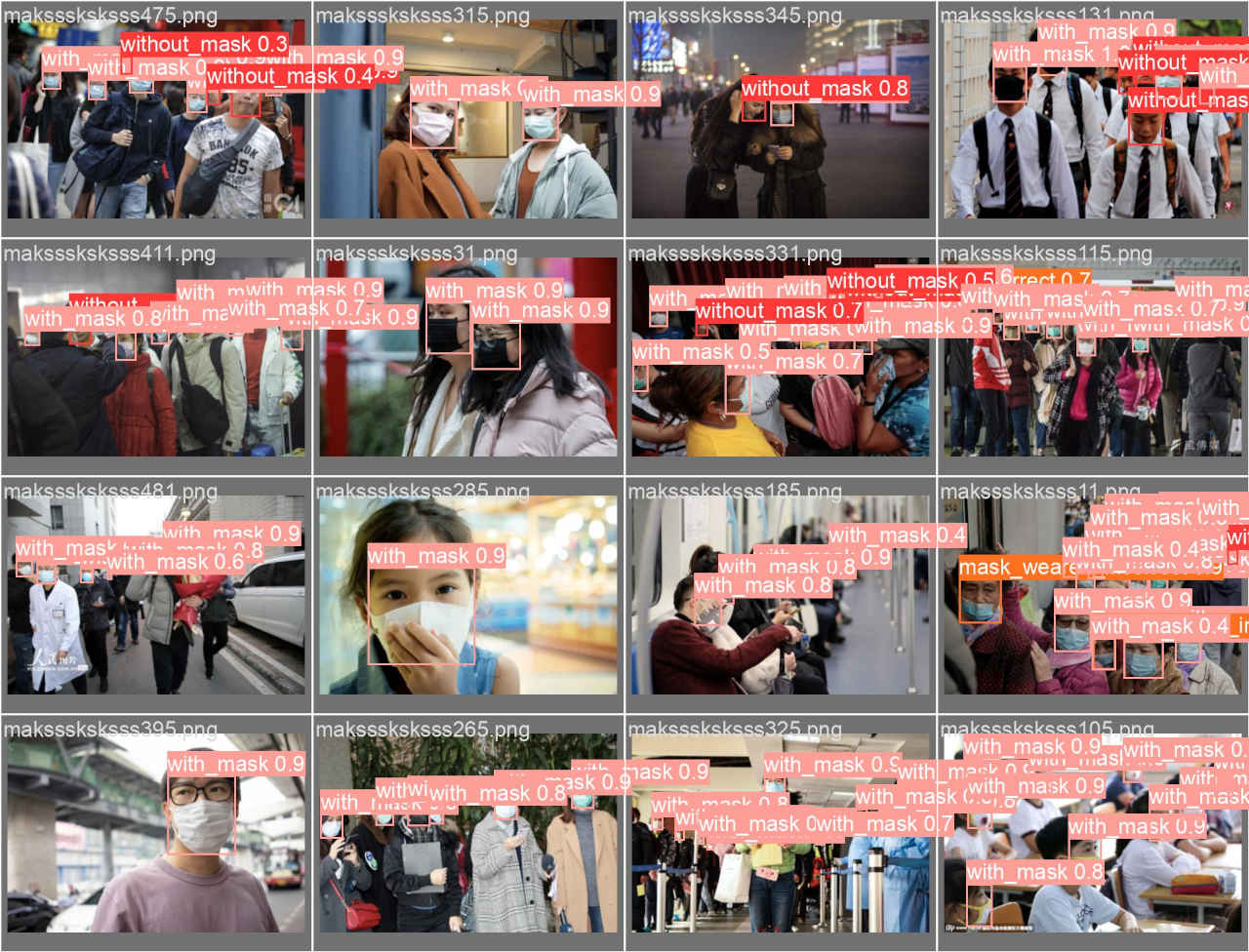 (py_learn) python train.py --epochs 100 --data data/mask_dataset/mask.yaml --weights yolov5s.pt --name mask_yolov5s train: weights=yolov5s.pt, cfg=, data=data/mask_dataset/mask.yaml, hyp=data\hyps\hyp.scratch-low.yaml, epochs=100, batch_size=16, imgsz=640, rect=False, resume=False, nosave=False, noval=False, noautoanchor=False, noplots=False, evolve=None, evolve_population=data\hyps, resume_evolve=None, bucket=, cache=None, image_weights=False, device=, multi_scale=False, single_cls=False, optimizer=SGD, sync_bn=False, workers=8, project=runs\train, name=mask_yolov5s, exist_ok=False, quad=False, cos_lr=False, label_smoothing=0.0, patience=100, freeze=[0], save_period=-1, seed=0, local_rank=-1, entity=None, upload_dataset=False, bbox_interval=-1, artifact_alias=latest, ndjson_console=False, ndjson_file=False github: YOLOv5 is out of date by 3 commits. Use 'git pull' or 'git clone https://github.com/ultralytics/yolov5' to update. YOLOv5 v7.0-294-gdb125a20 Python-3.11.8 torch-2.2.1+cu121 CUDA:0 (NVIDIA GeForce RTX 4070 Ti, 12282MiB) hyperparameters: lr0=0.01, lrf=0.01, momentum=0.937, weight_decay=0.0005, warmup_epochs=3.0, warmup_momentum=0.8, warmup_bias_lr=0.1, box=0.05, cls=0.5, cls_pw=1.0, obj=1.0, obj_pw=1.0, iou_t=0.2, anchor_t=4.0, fl_gamma=0.0, hsv_h=0.015, hsv_s=0.7, hsv_v=0.4, degrees=0.0, translate=0.1, scale=0.5, shear=0.0, perspective=0.0, flipud=0.0, fliplr=0.5, mosaic=1.0, mixup=0.0, copy_paste=0.0 Comet: run 'pip install comet_ml' to automatically track and visualize YOLOv5 runs in Comet TensorBoard: Start with 'tensorboard --logdir runs\train', view at http://localhost:6006/ Overriding model.yaml nc=80 with nc=4 from n params module arguments 0 -1 1 3520 models.common.Conv [3, 32, 6, 2, 2] 1 -1 1 18560 models.common.Conv [32, 64, 3, 2] 2 -1 1 18816 models.common.C3 [64, 64, 1] 3 -1 1 73984 models.common.Conv [64, 128, 3, 2] : Starting training for 100 epochs... Epoch GPU_mem box_loss obj_loss cls_loss Instances Size 0/99 3.35G 0.1051 0.06055 0.03577 79 640: 100%|██████████| 43/43 [00:04<00:00, 9. Class Images Instances P R mAP50 mAP50-95: 100%|██████████| 6/6 [00:01<0 all 171 778 0.69 0.0704 0.0216 0.00536 : Epoch GPU_mem box_loss obj_loss cls_loss Instances Size 99/99 4.41G 0.01885 0.01993 0.001163 75 640: 100%|██████████| 43/43 [00:03<00:00, 11. Class Images Instances P R mAP50 mAP50-95: 100%|██████████| 6/6 [00:01<0 all 171 778 0.848 0.814 0.86 0.59 100 epochs completed in 0.143 hours. Optimizer stripped from runs\train\mask_yolov5s\weights\last.pt, 14.4MB Optimizer stripped from runs\train\mask_yolov5s\weights\best.pt, 14.4MB Validating runs\train\mask_yolov5s\weights\best.pt... Fusing layers... Model summary: 157 layers, 7020913 parameters, 0 gradients, 15.8 GFLOPs Class Images Instances P R mAP50 mAP50-95: 100%|██████████| 6/6 [00:01<0 all 171 778 0.859 0.849 0.888 0.609 without_mask 171 122 0.773 0.885 0.899 0.59 with_mask 171 630 0.932 0.931 0.965 0.684 mask_weared_incorrect 171 26 0.872 0.731 0.801 0.554 Results saved to runs\train\mask_yolov5s