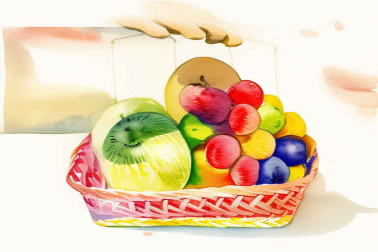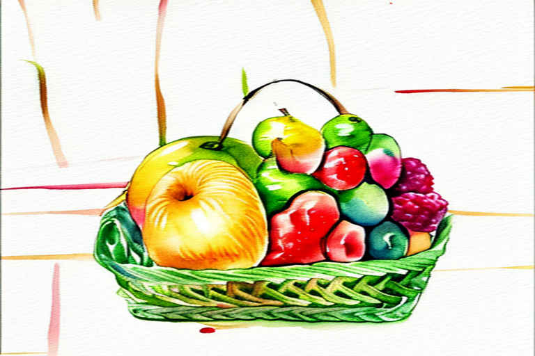 Fruits in a basket, watercolor painting, on a white background