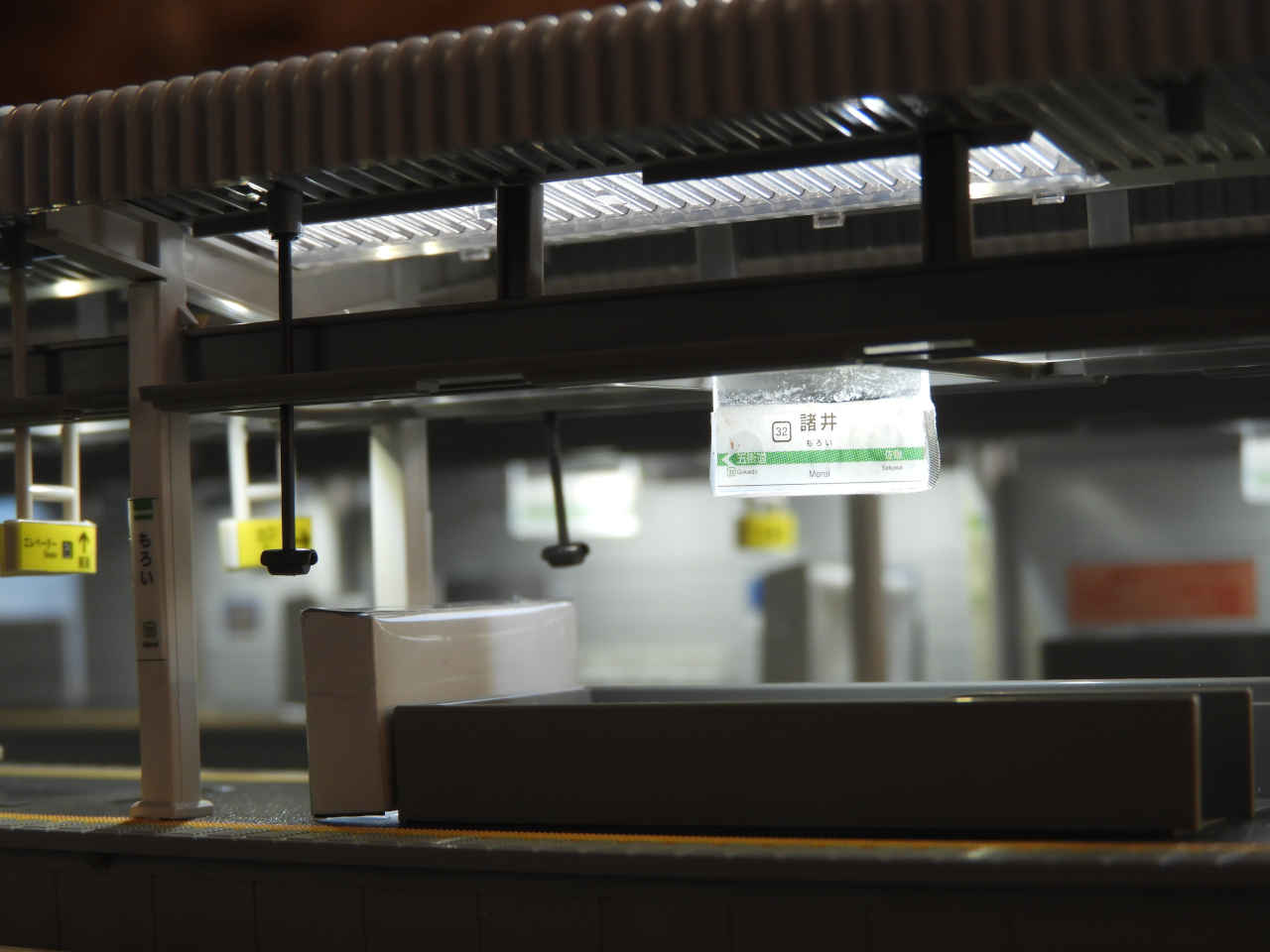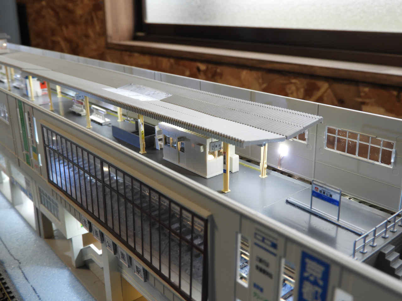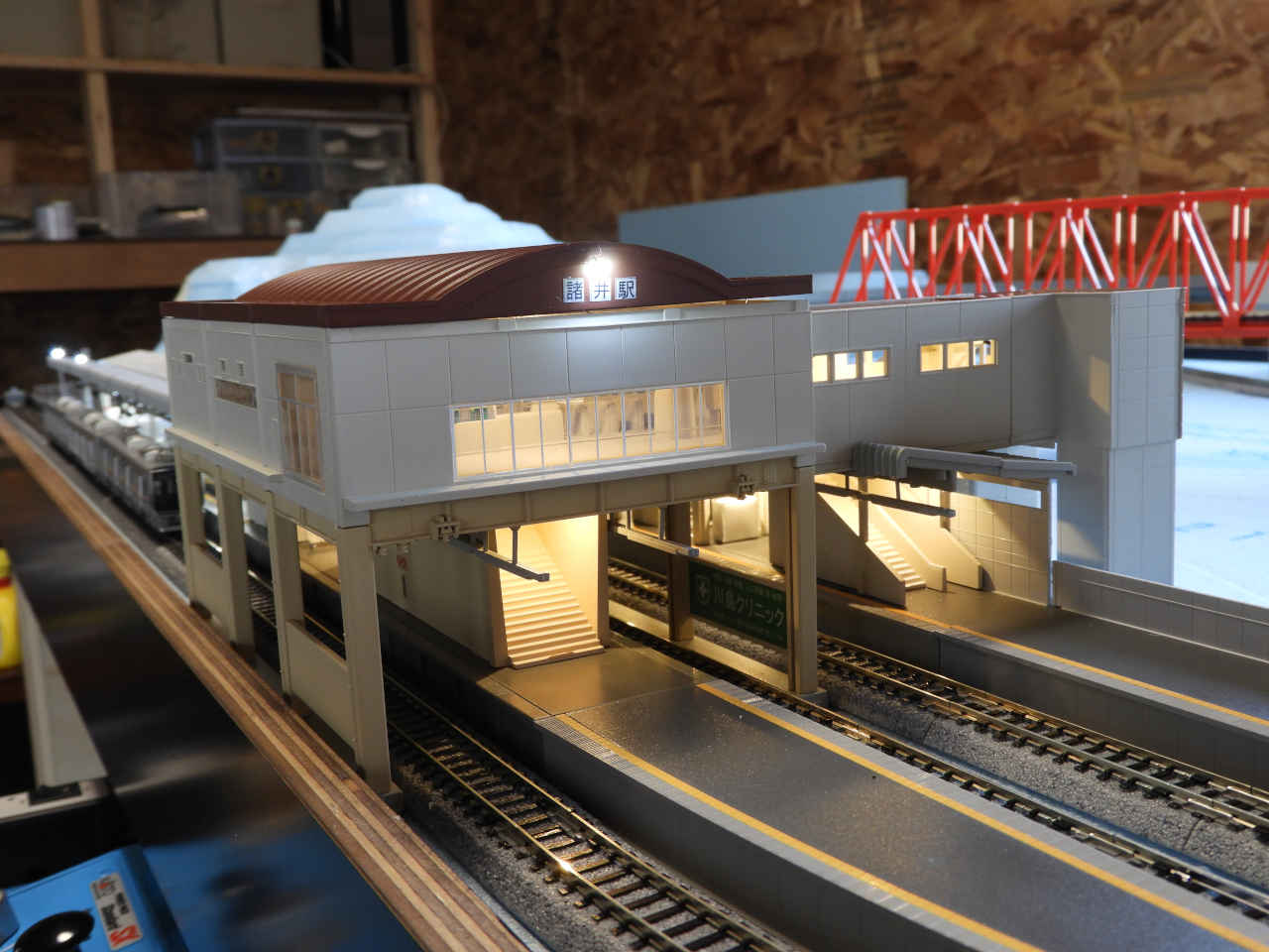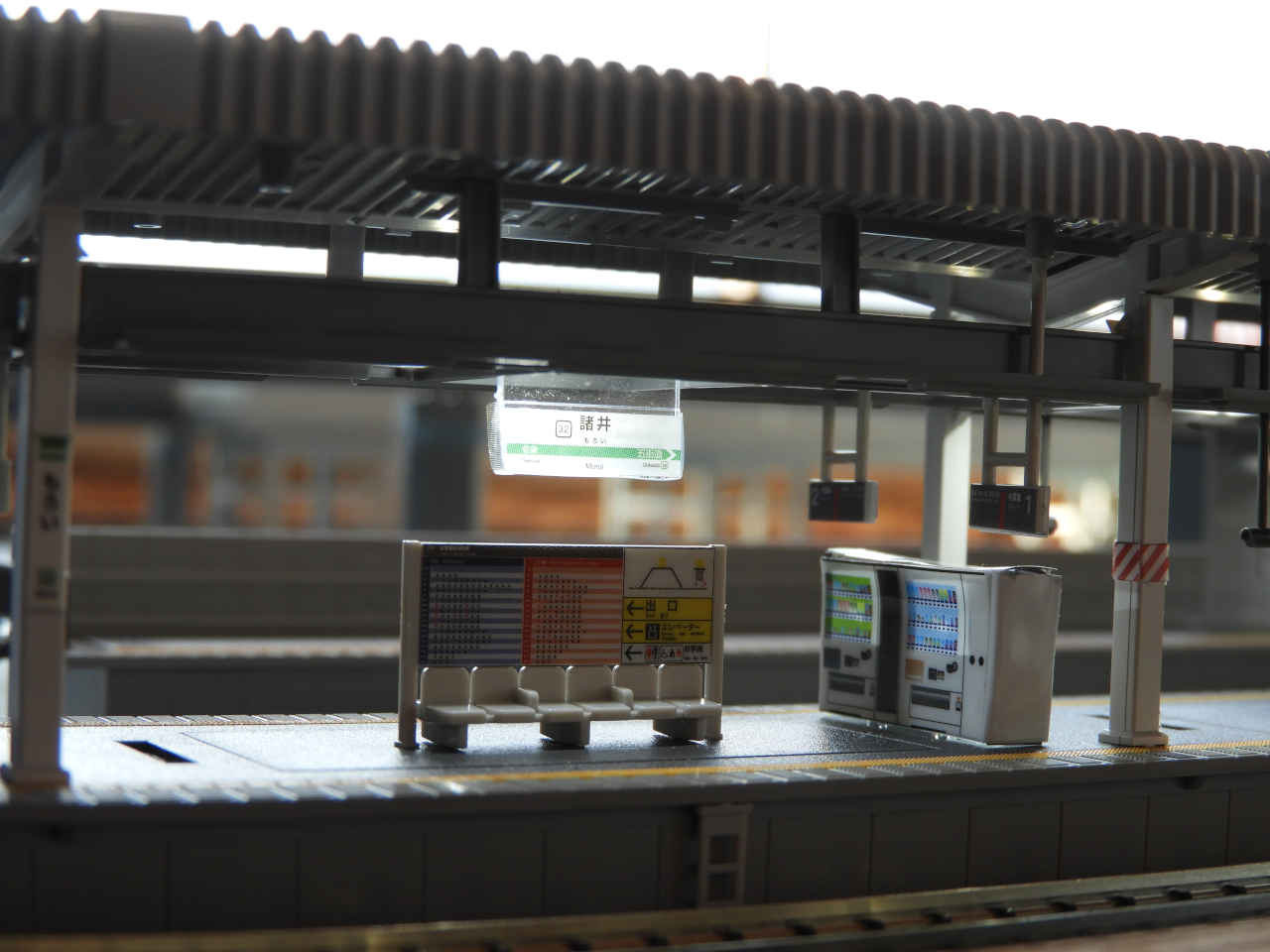 ホームに小物を配置して設置。シールの手持ちから駅名は「諸井駅」とする。