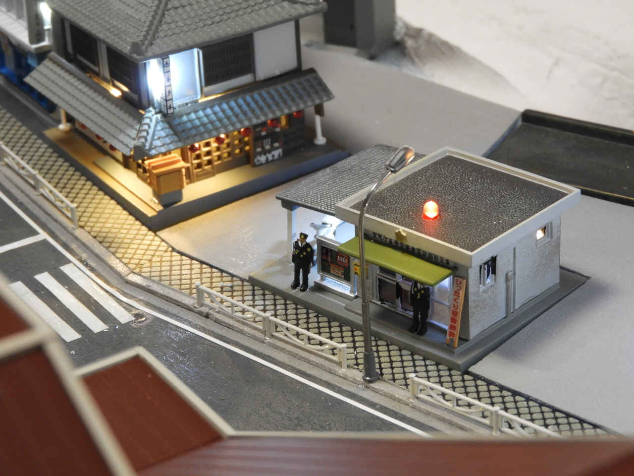 駅前交番と商店街の建物