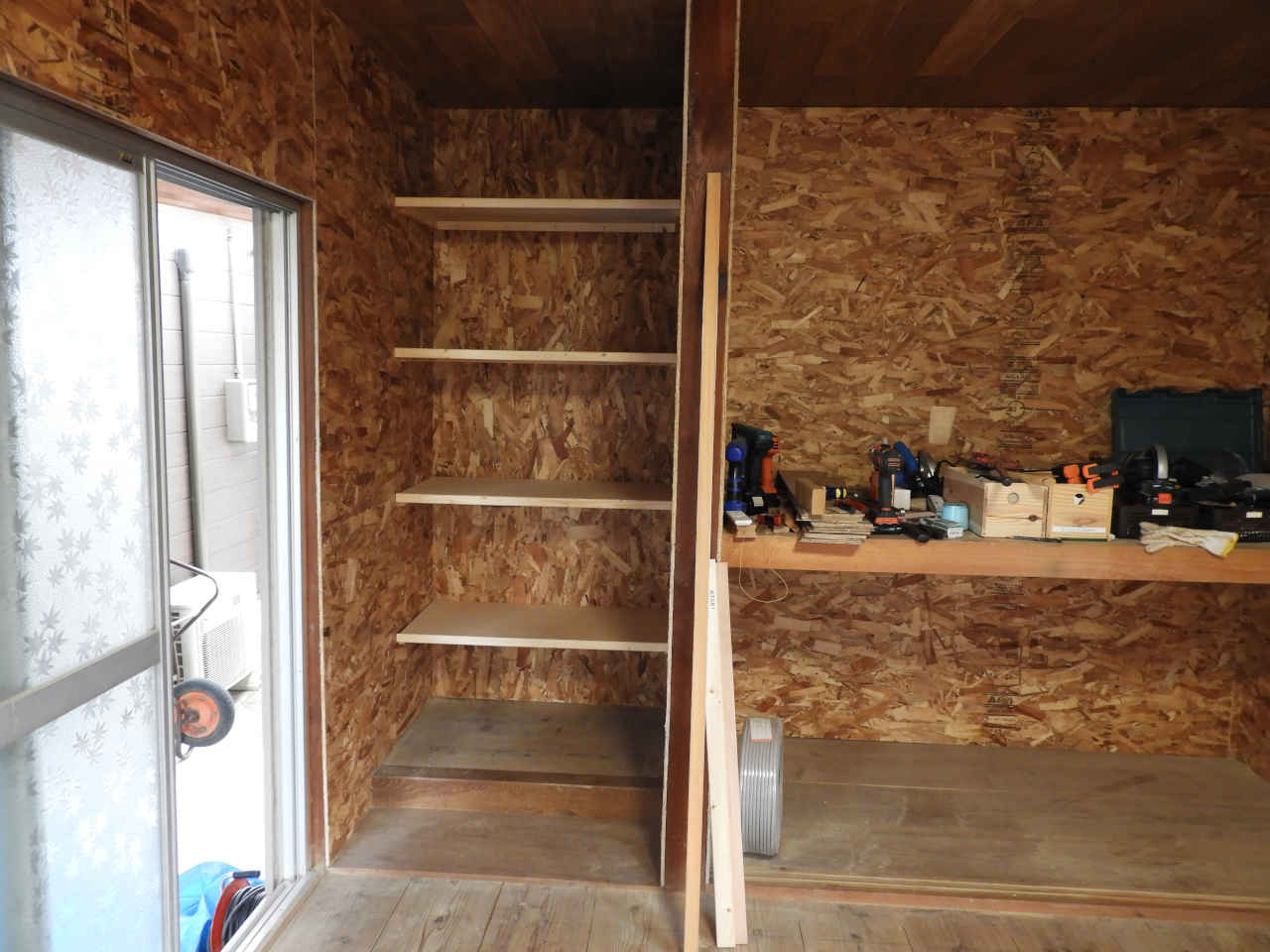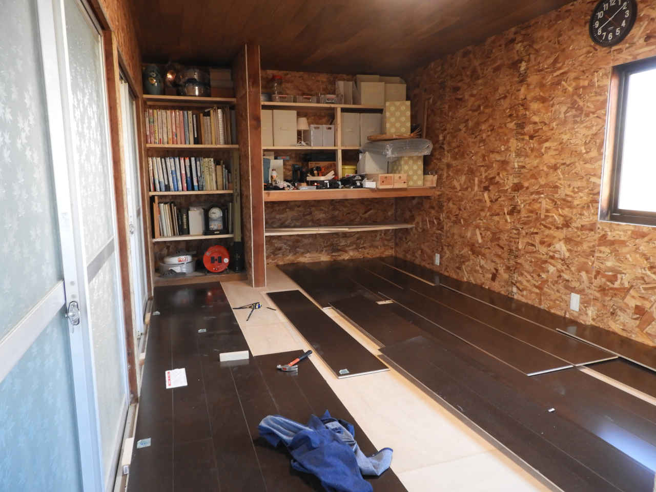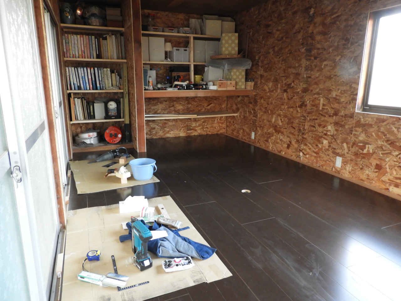 - 設置した棚に隣の部屋に押し込んだ、書籍・アルバムなどを移動。入り口の部屋の改装準備。