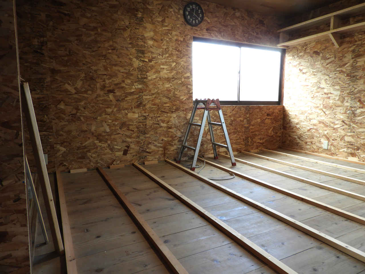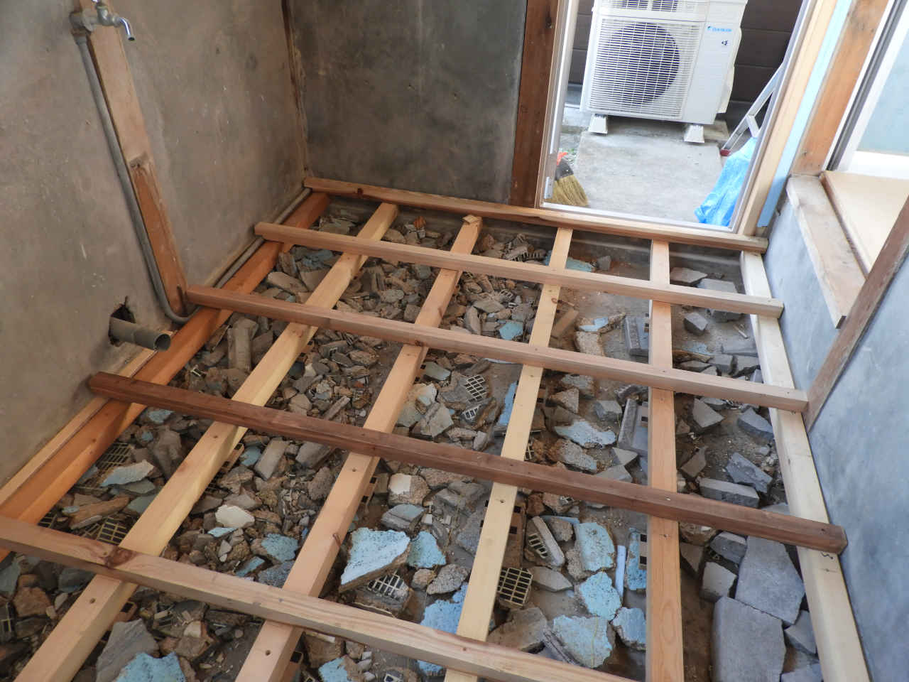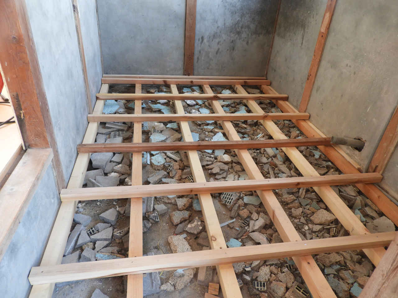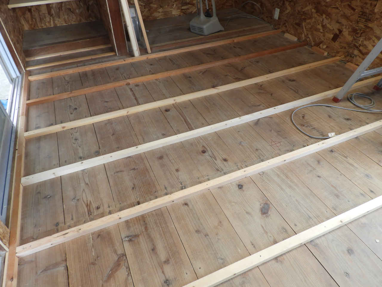 - 元の板張りの床に 40x30mm の角材を渡して補強する。
