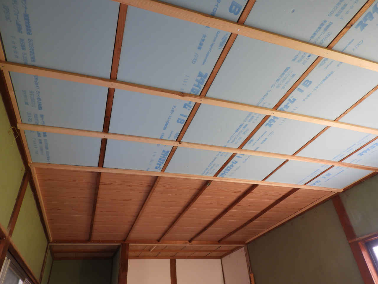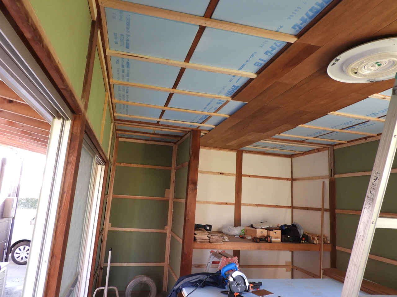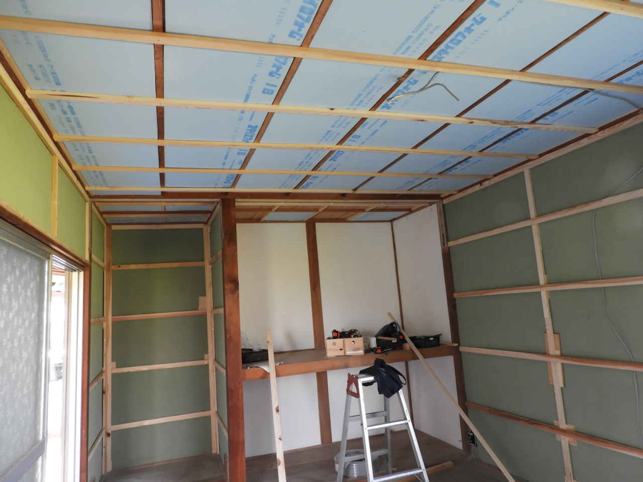 - 釣り天井の淵との段差分の角材を900mmピッチに貼って天井板のガイドにする。隙間にスタイロホームを貼って断熱する。