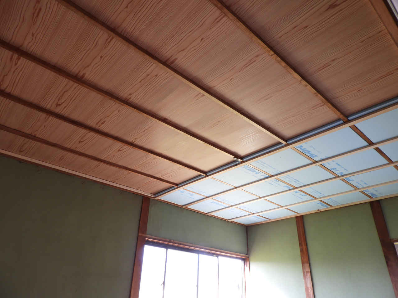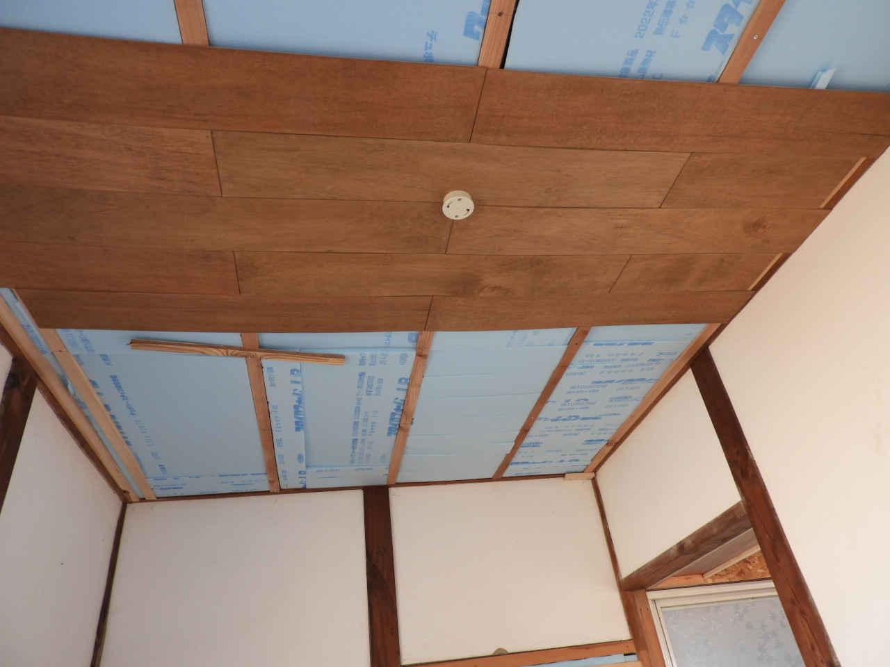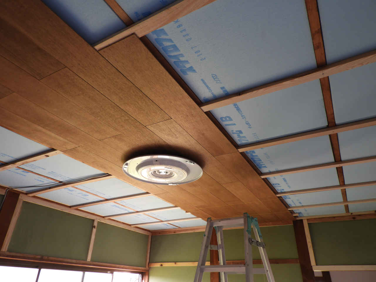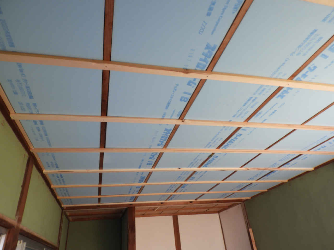 - 釣り天井の淵との段差分の角材を900mmピッチに貼って天井板のガイドにする。隙間にスタイロホームを貼って断熱する。