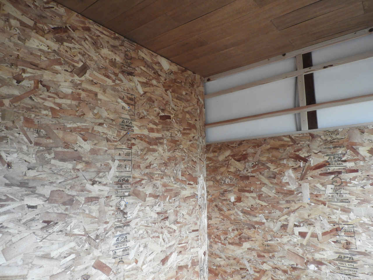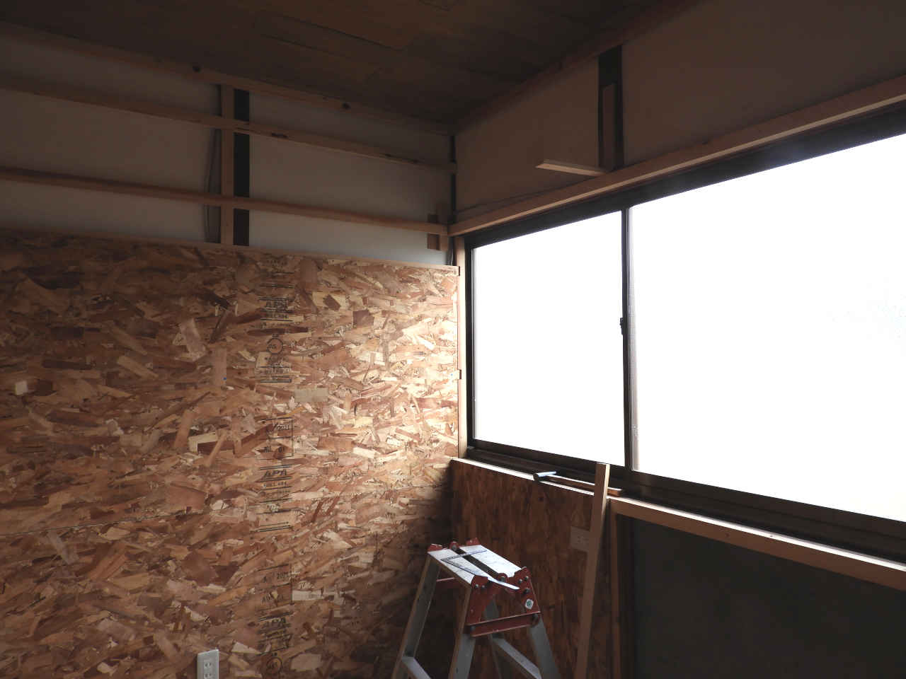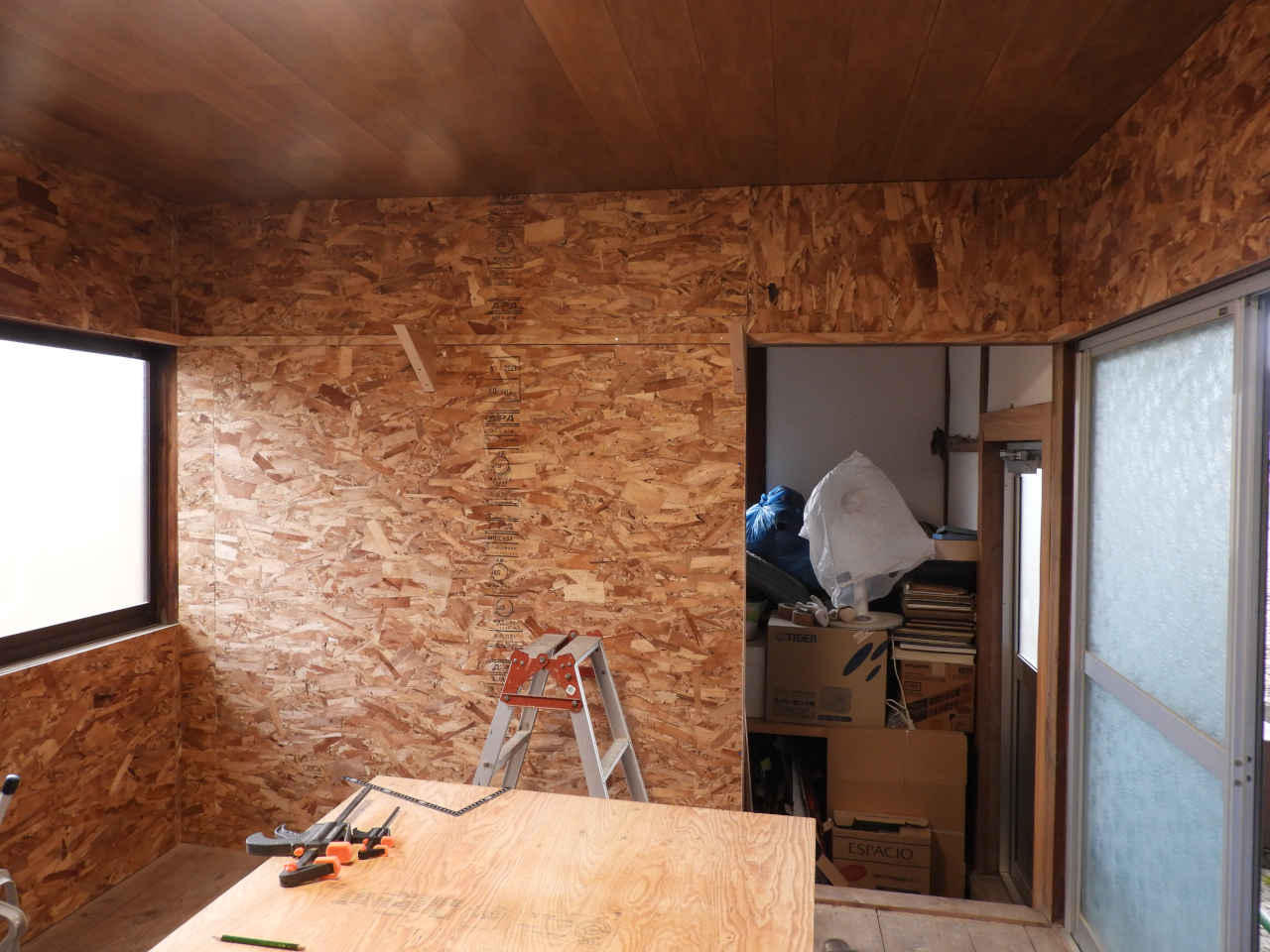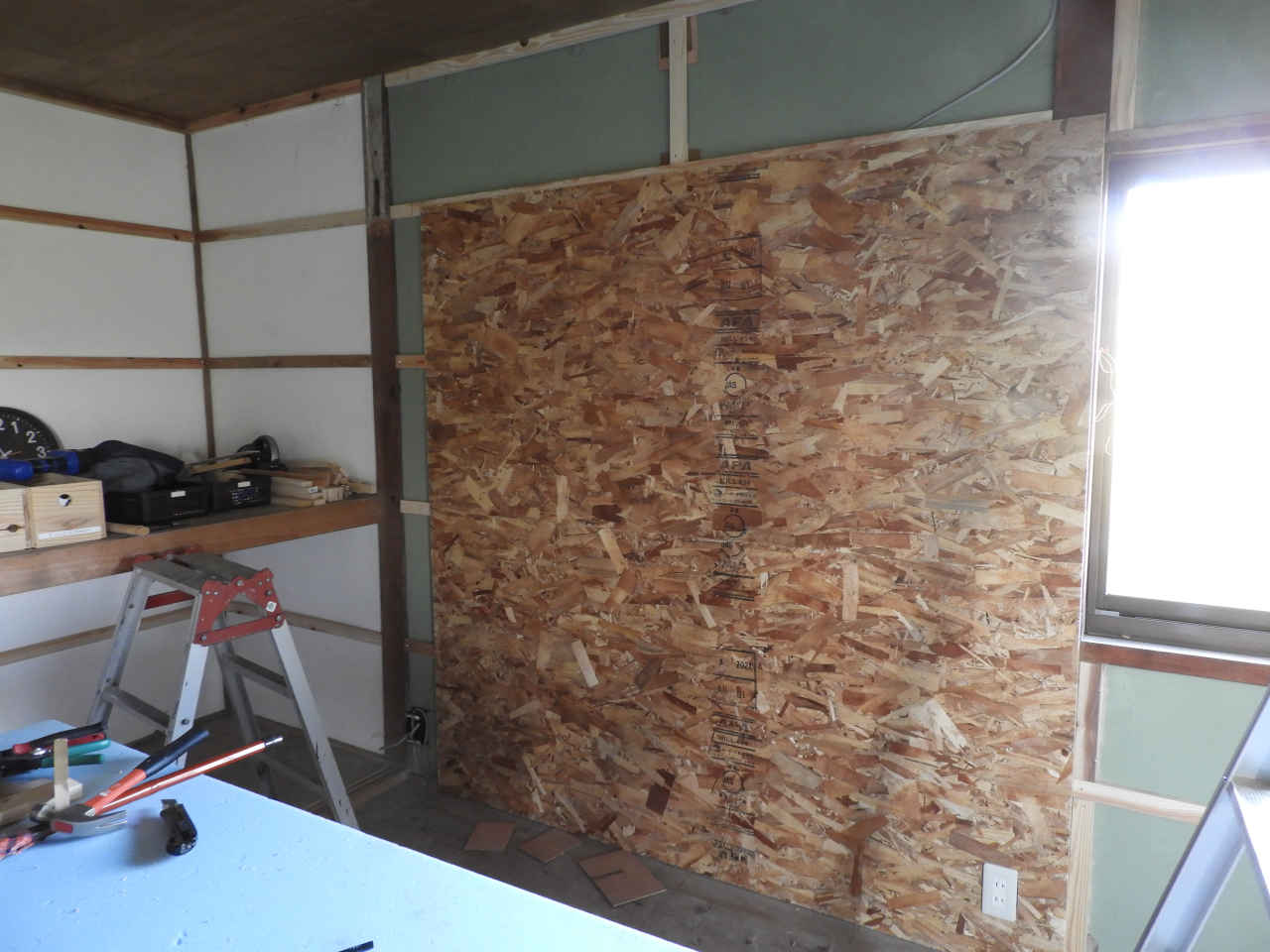 - 土壁と柱の間に角材を455mmピッチに渡して 9mm OSB 合板を貼る。