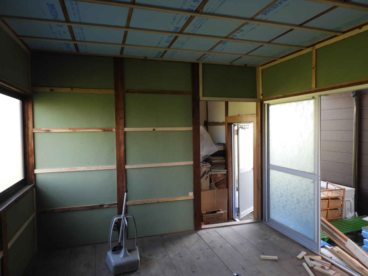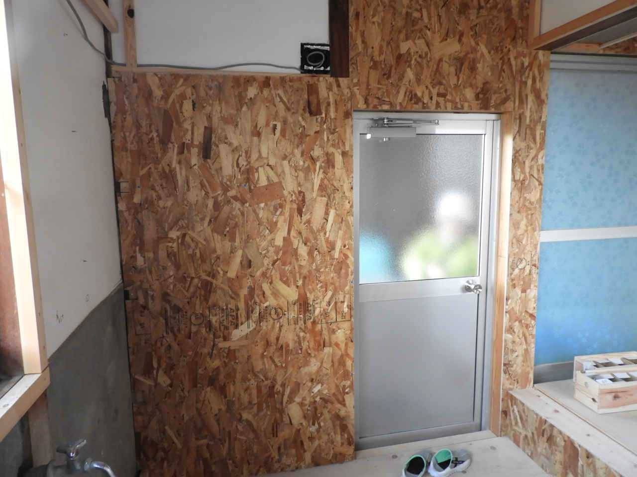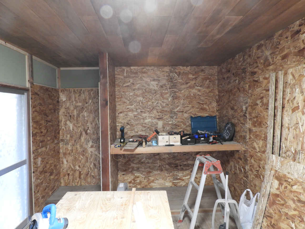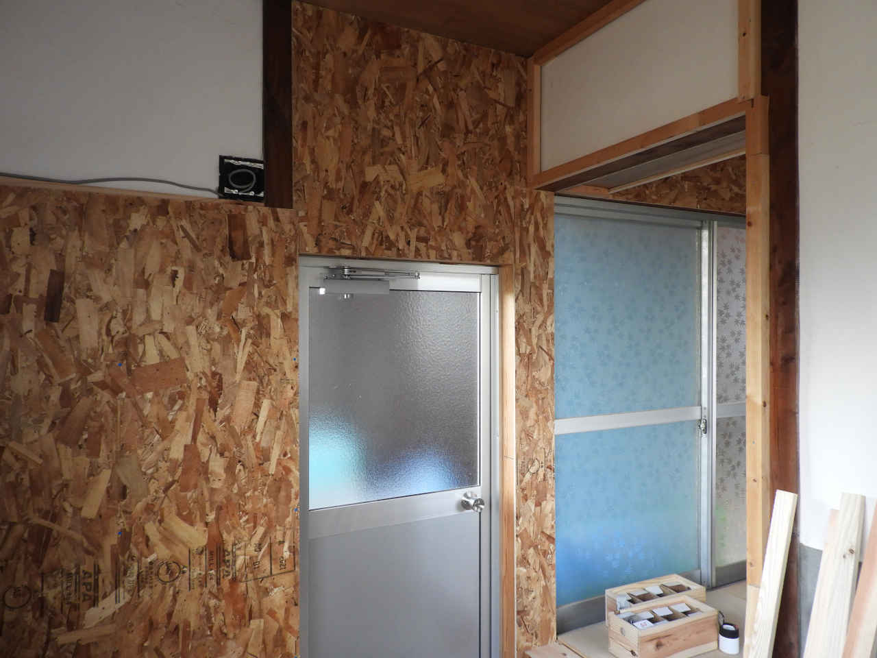 - 土壁と柱の間に角材を455mmピッチに渡して 9mm OSB 合板を貼る。
