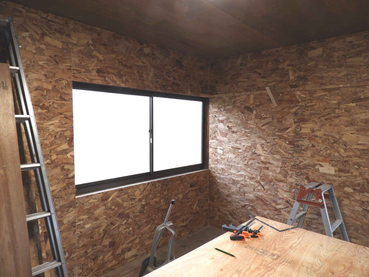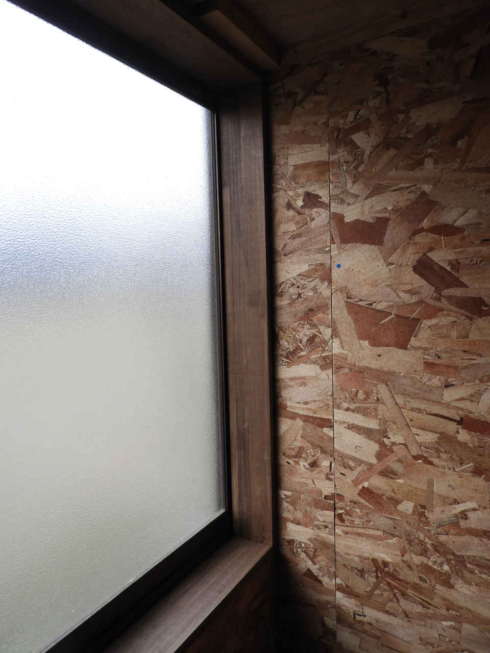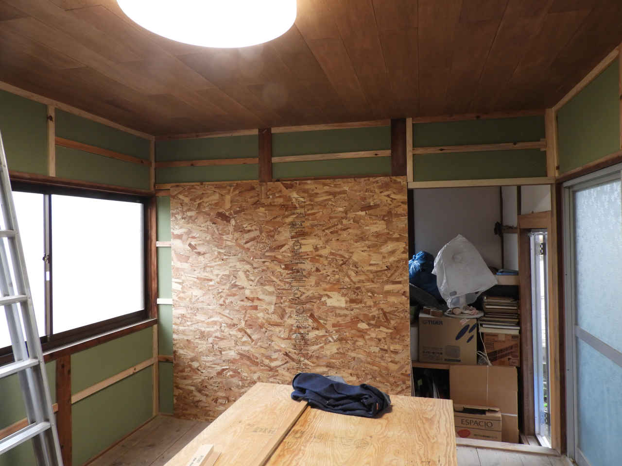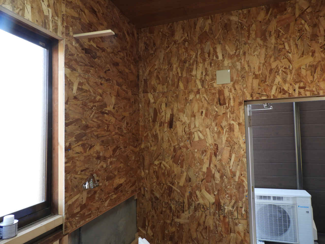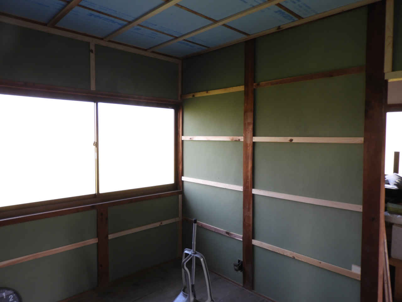 - 土壁と柱の間に角材を455mmピッチに渡して 9mm OSB 合板を貼る。