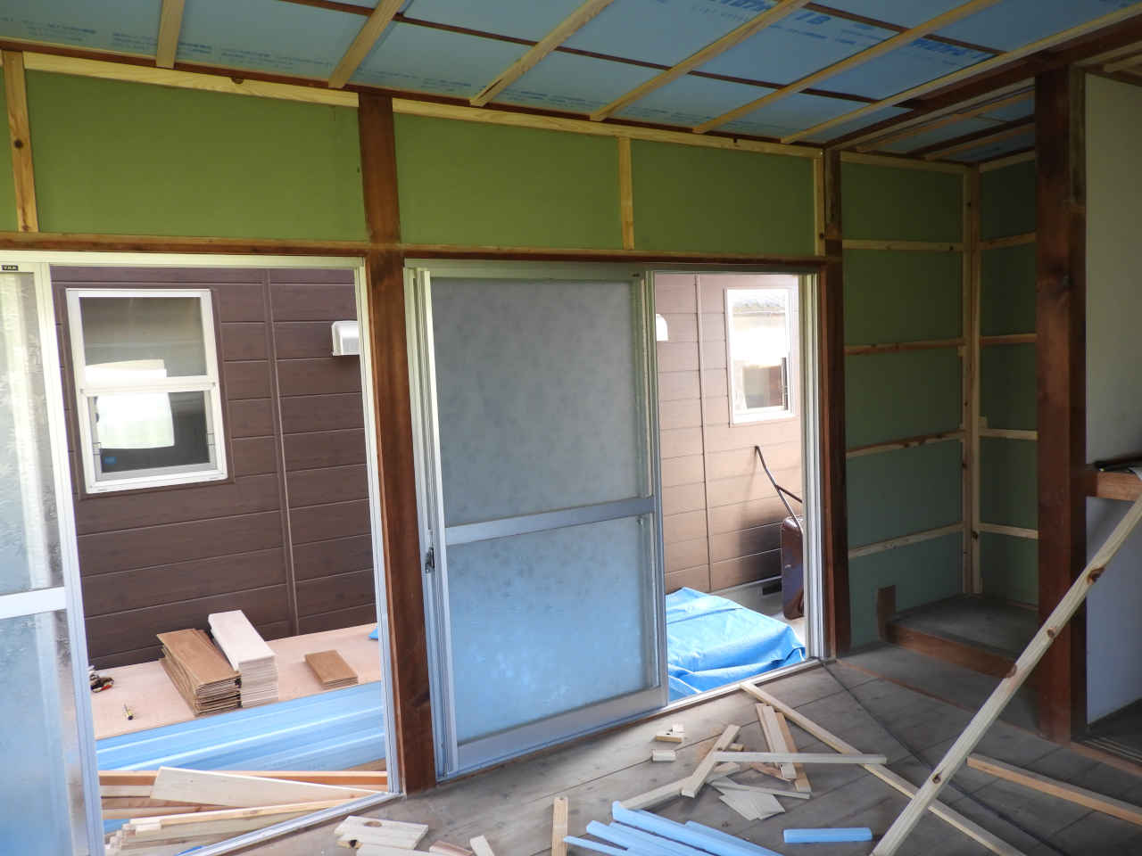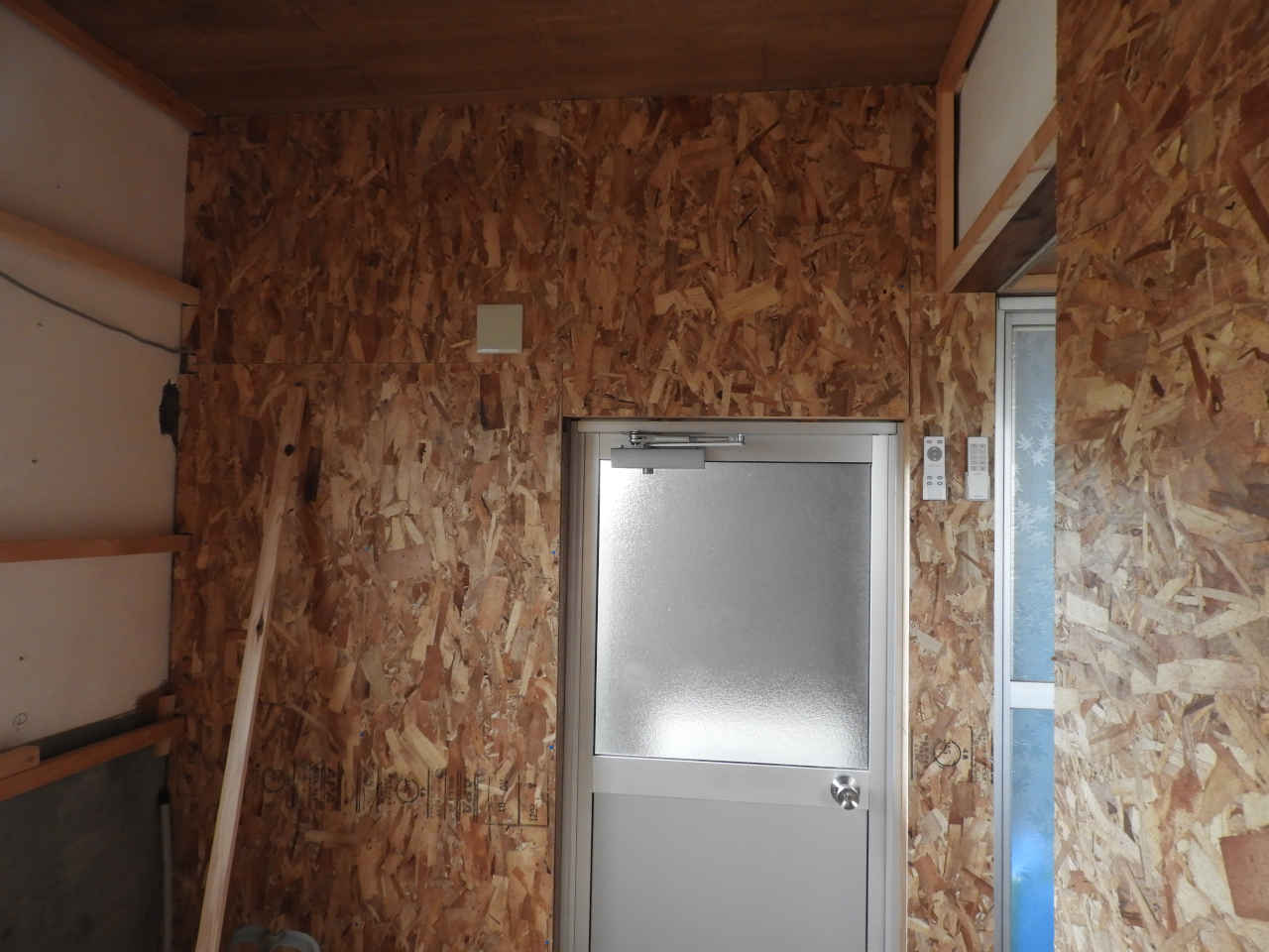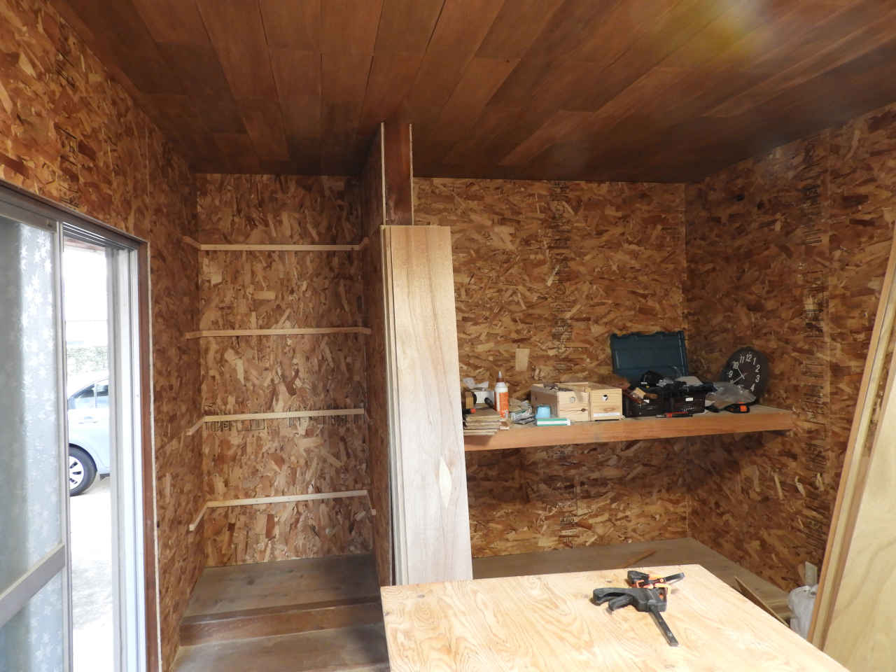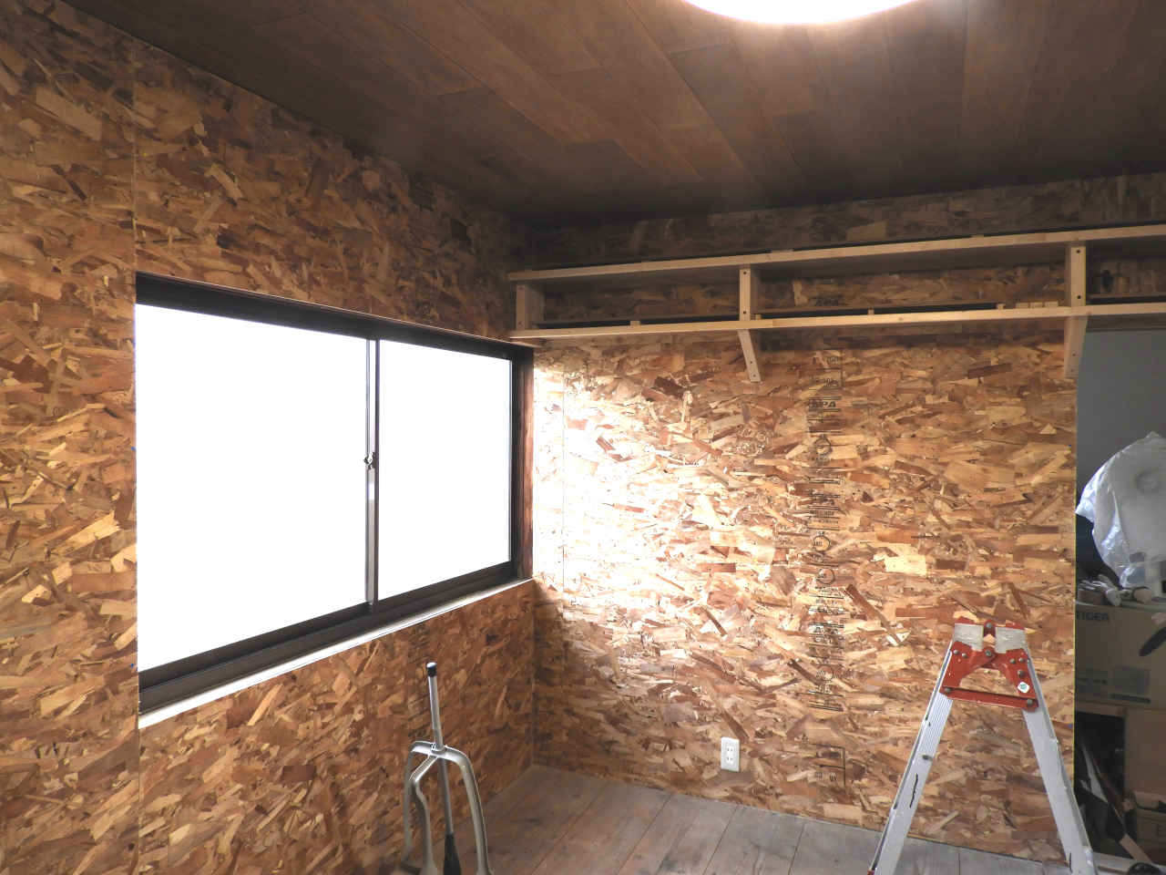 - 土壁と柱の間に角材を455mmピッチに渡して 9mm OSB 合板を貼る。