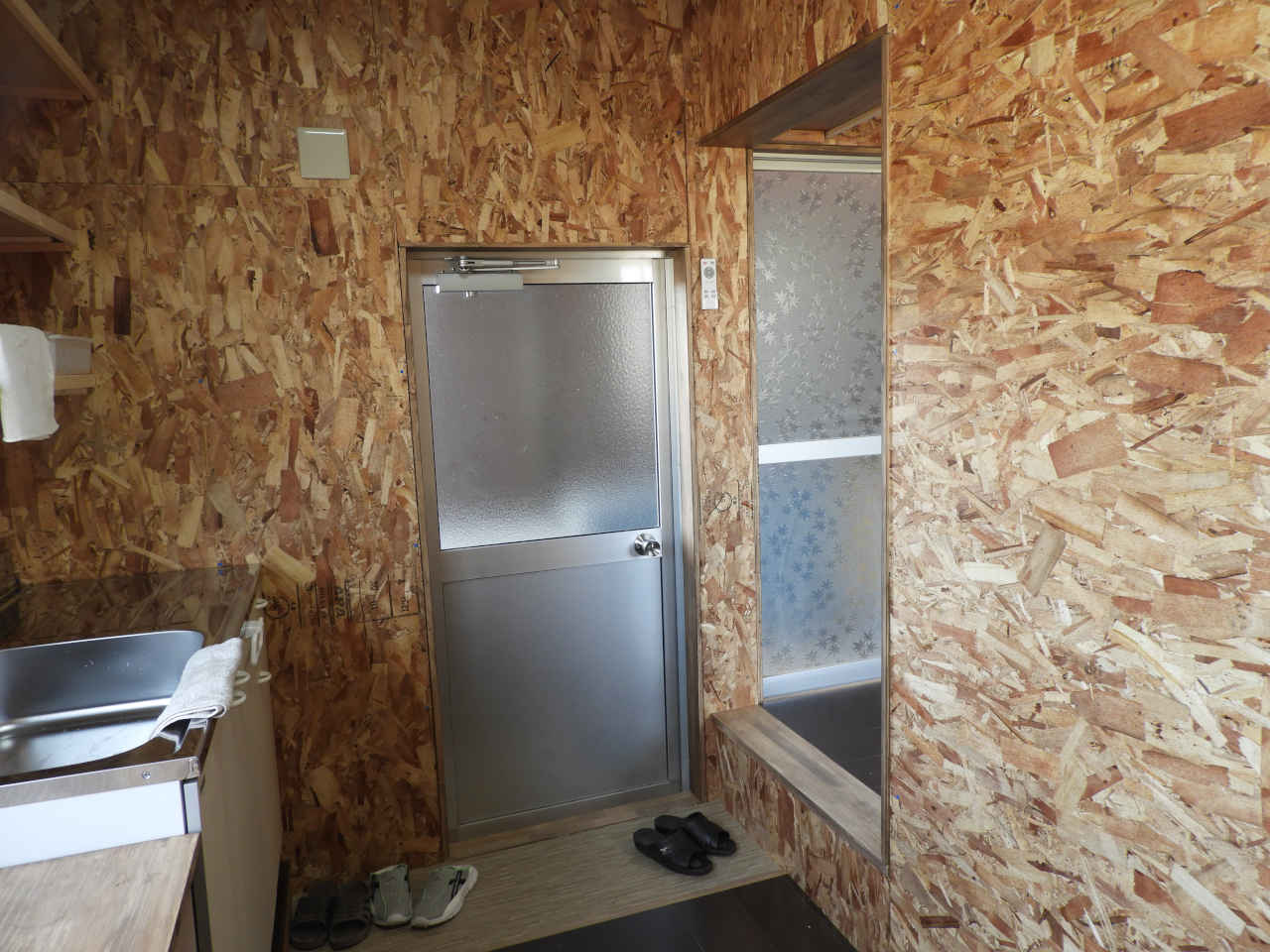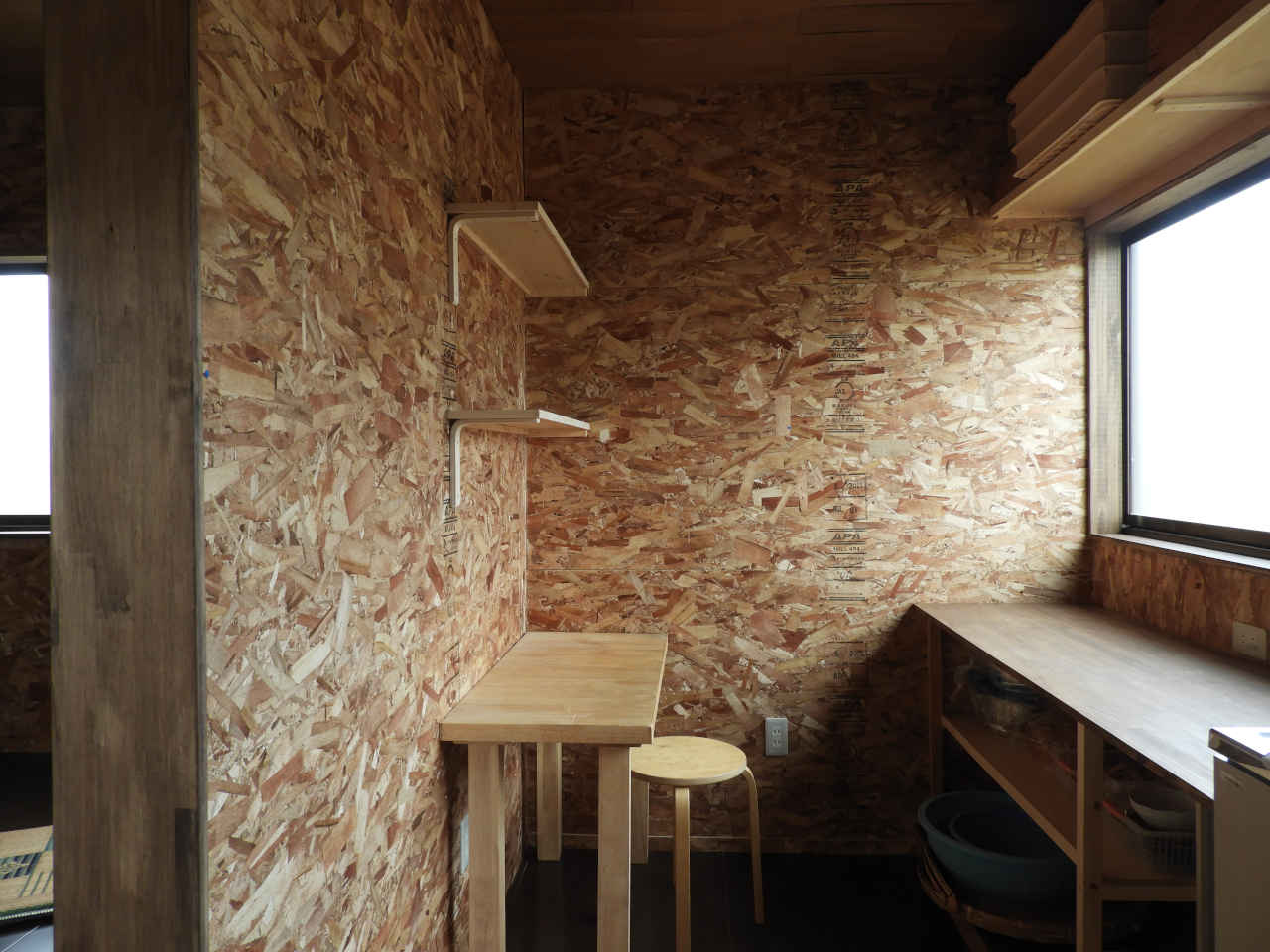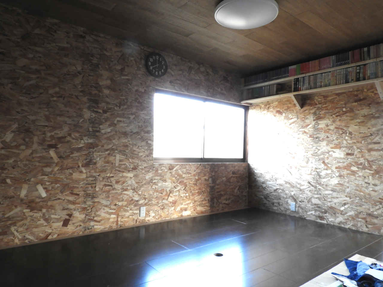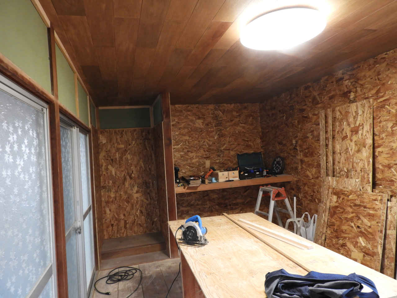 - 土壁と柱の間に角材を455mmピッチに渡して 9mm OSB 合板を貼る。