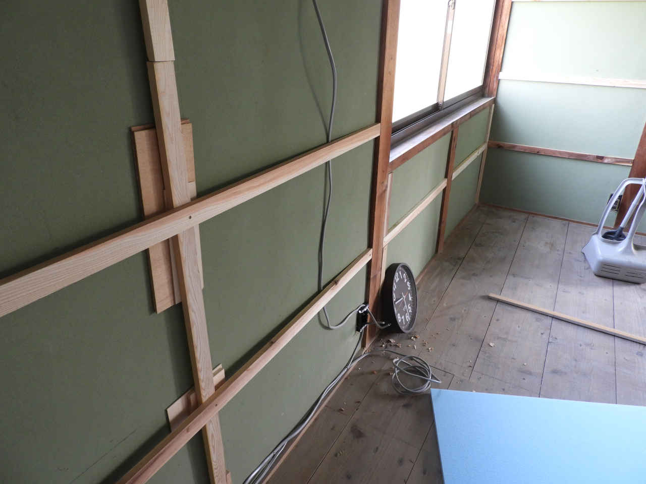 - 土壁と柱の段差分の板を455mmピッチになるように貼って壁板を貼るベースにする。