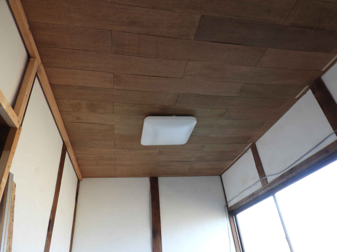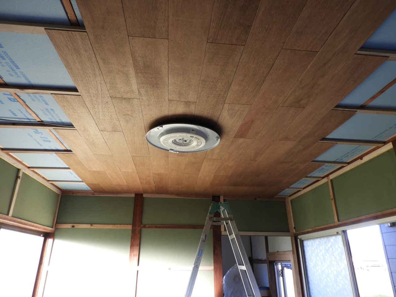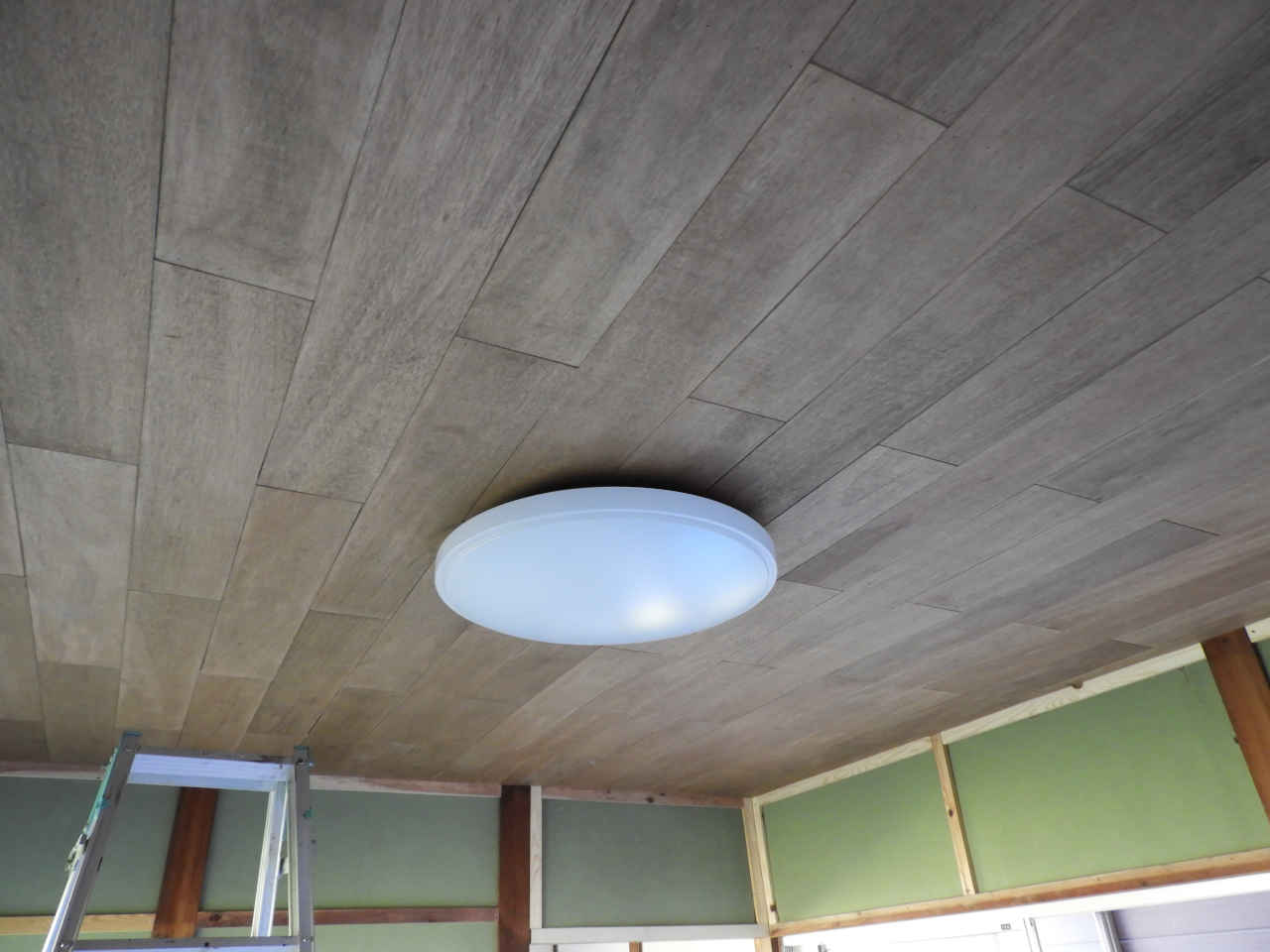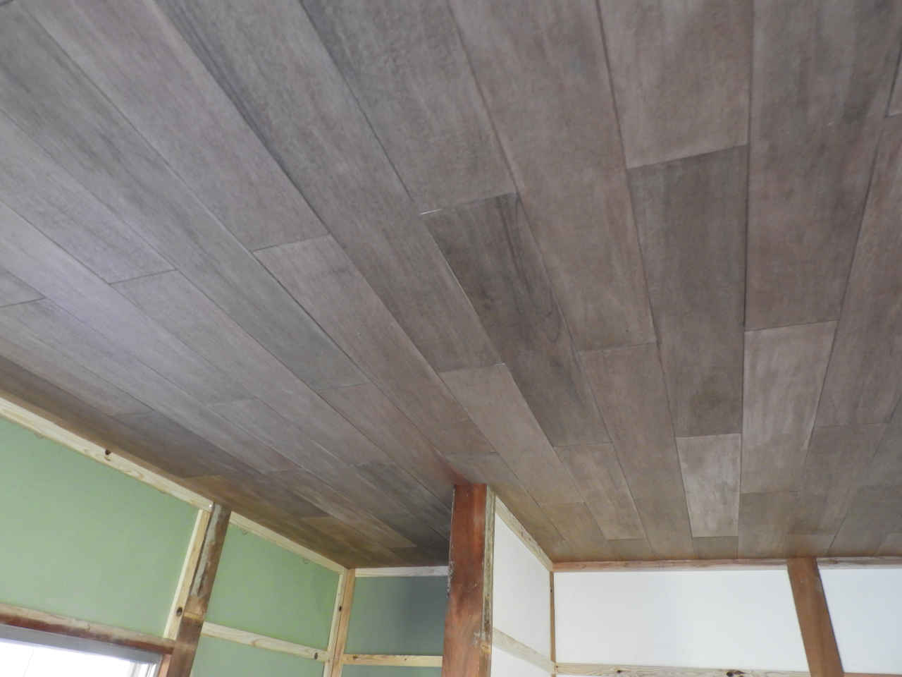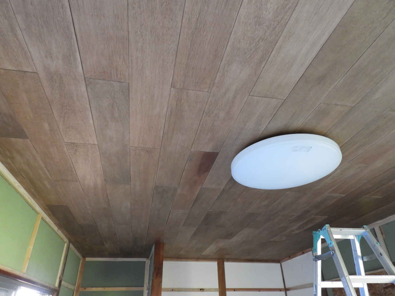 天井板は 8畳間と同じく2.5mmラワンベニヤ板を900x150mmにカットしビンテージワックスを塗布してフィニッシュネイラーで打ち付ける。