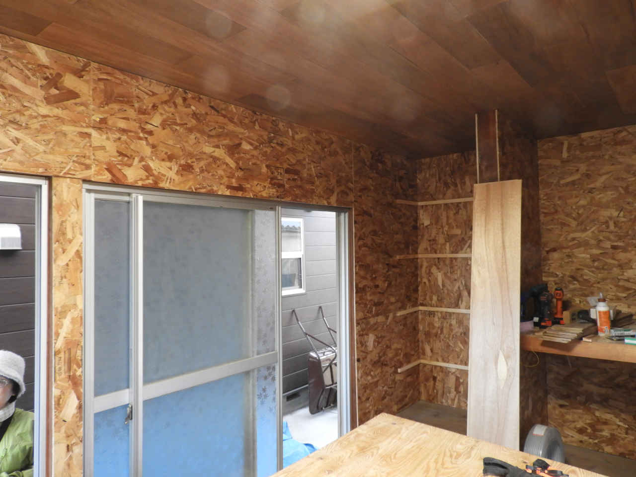 - 天井板は2.5mmラワンベニヤ板を900x150mmにカットしビンテージワックスを塗布して、このために購入した充電式フィニッシュネイラーで打ち付ける。