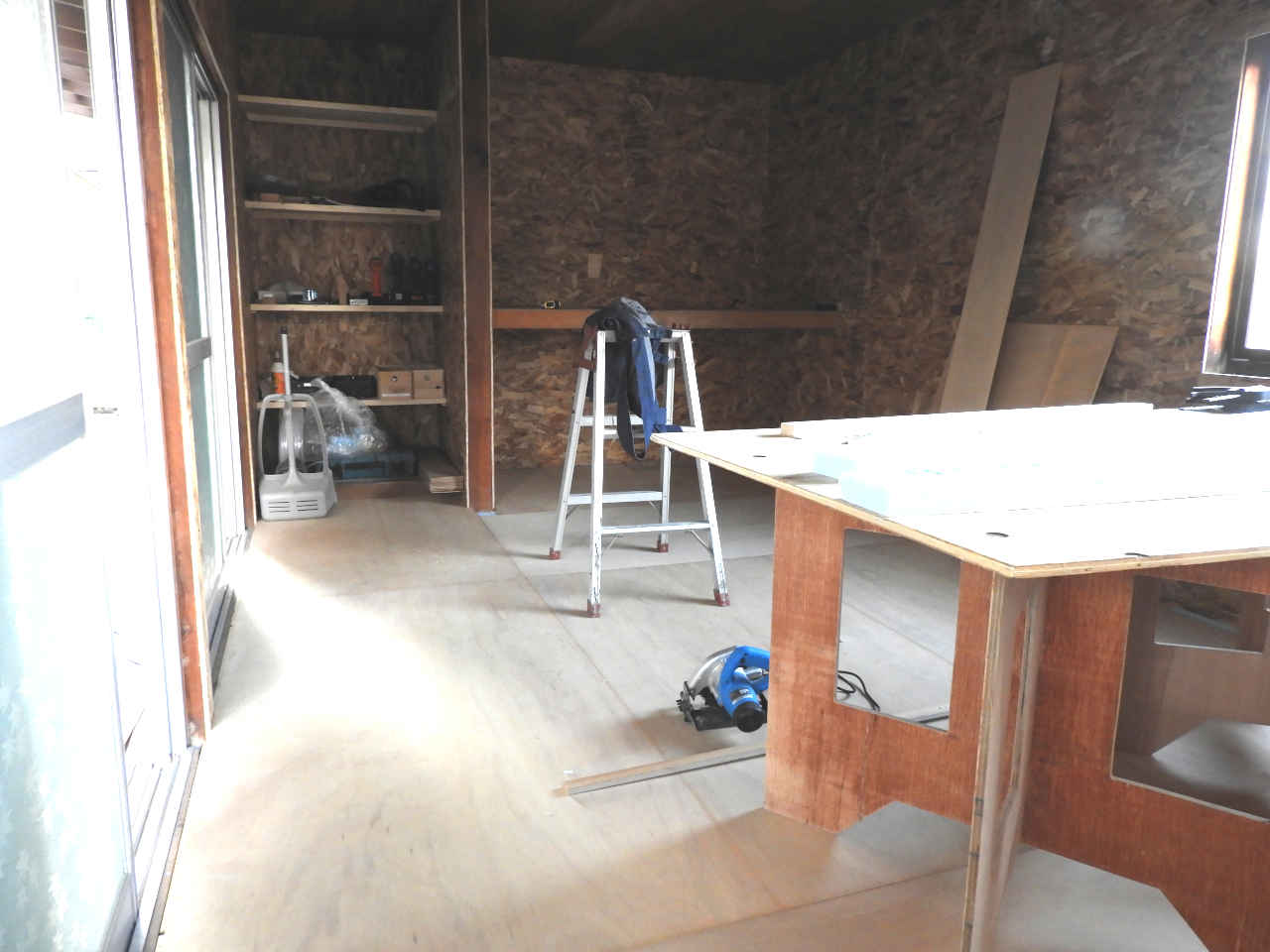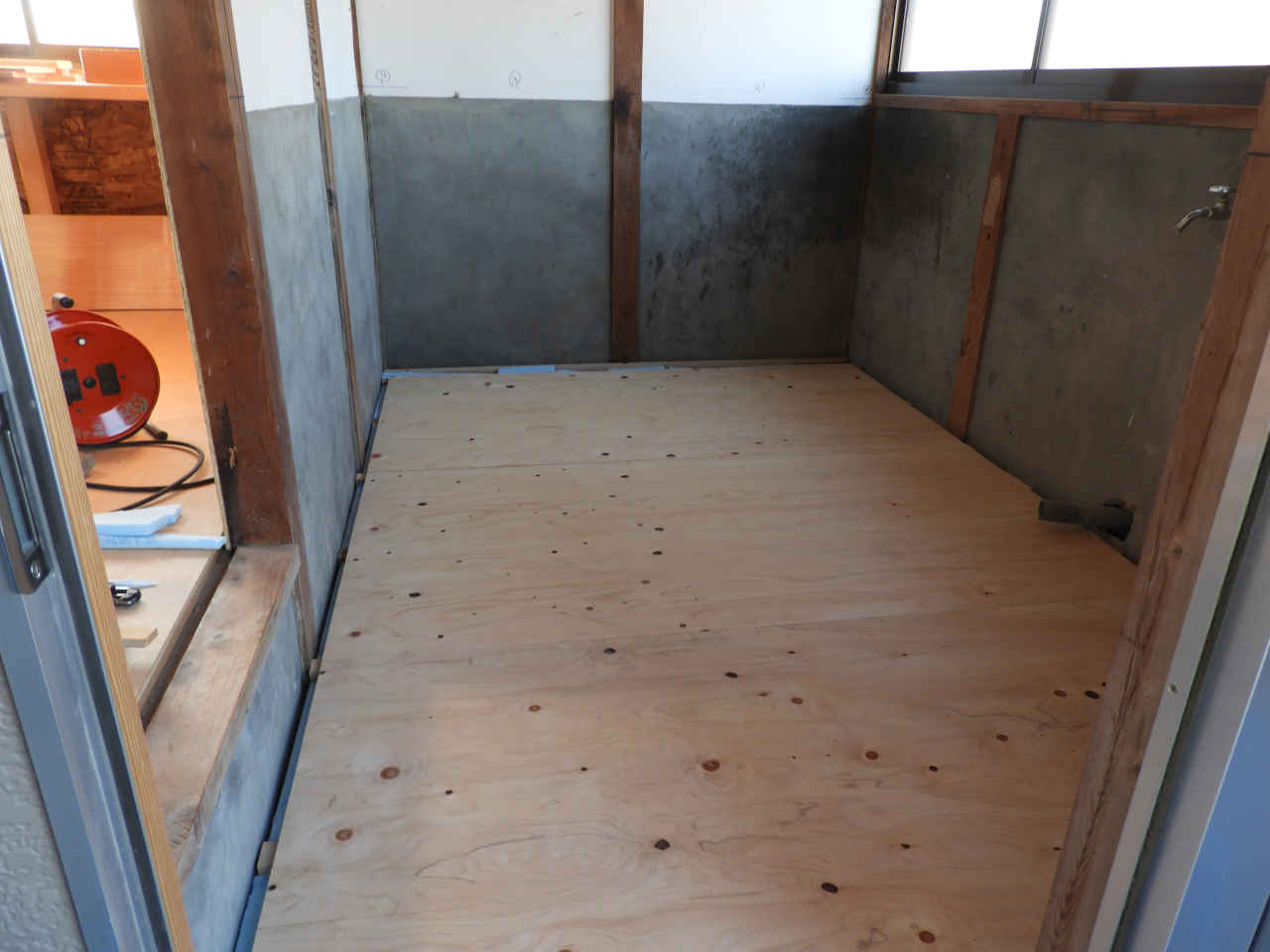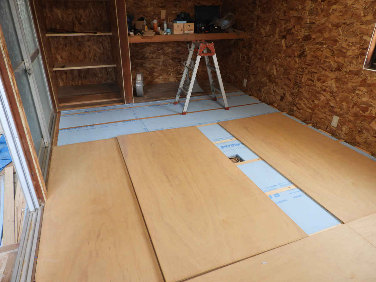 - 角材の間に 30mm厚の断熱材(スタイロホーム)を入れてその上に 12mmのコンパネを貼る。