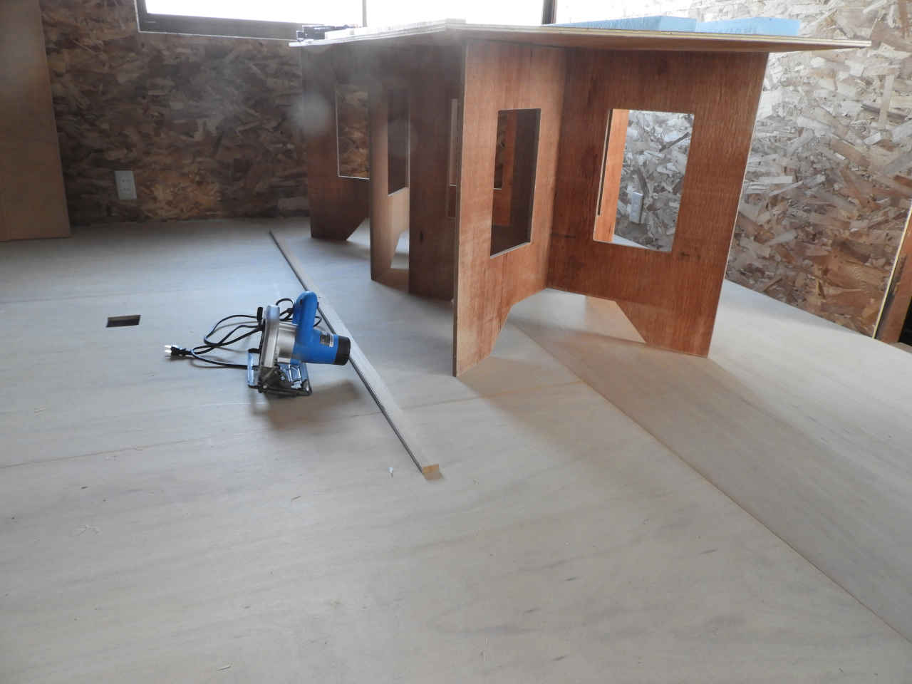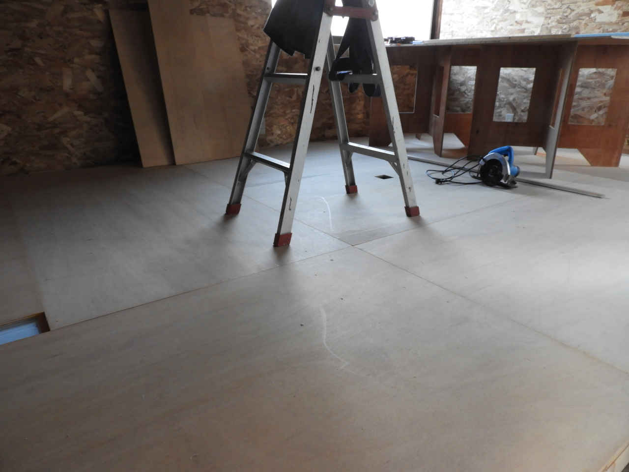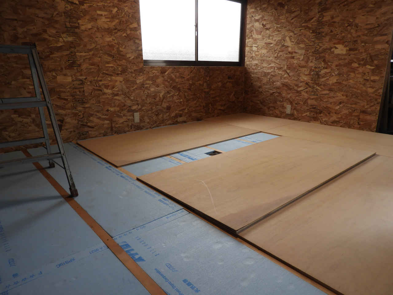- 角材の間に 30mm厚の断熱材(スタイロホーム)を入れてその上に 12mmのコンパネを貼る。