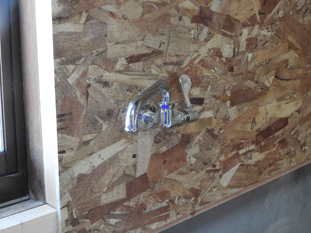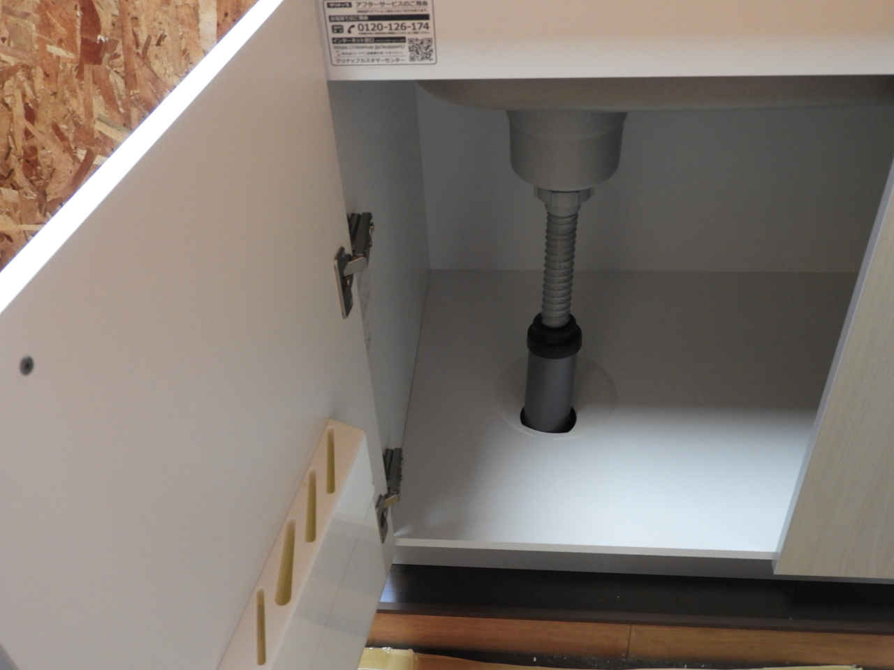 - 排水管の施工のため流し台の下の床を挙げることにする。残り部分はフローリングを貼る。